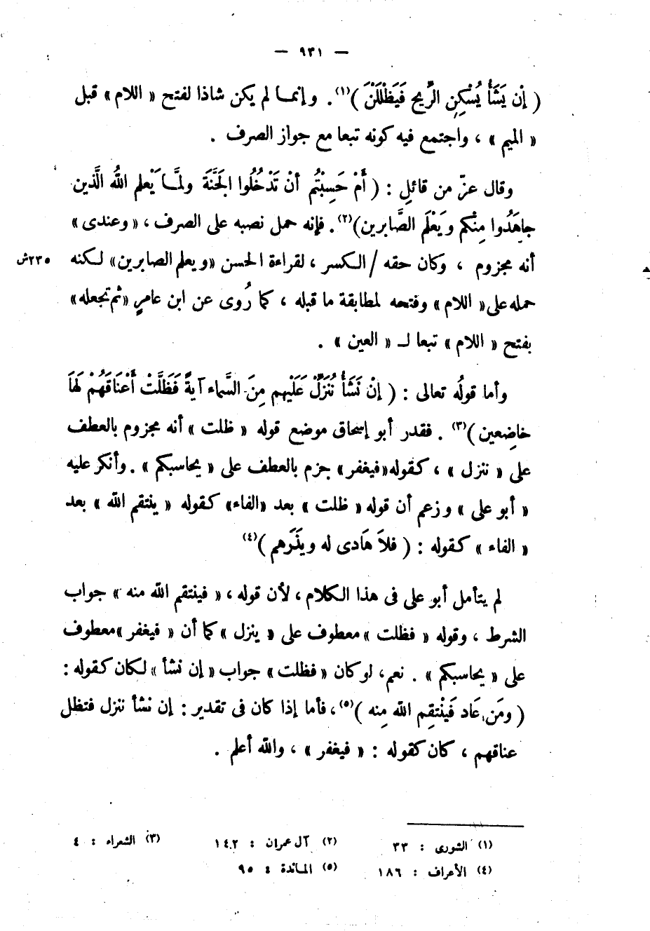وقال عز من قائل: (أَمْ حَسِبْتُمْ أَنْ تَدْخُلُوا الْجَنَّةَ وَلَمَّا يَعْلَمِ اللَّهُ الَّذِينَ جاهَدُوا مِنْكُمْ وَيَعْلَمَ الصَّابِرِينَ) «2» . فإنه حمل نصبه على الصرف، و «عندى» أنه مجزوم، وكان حقه/ الكسر، لقراءة الحسن «ويعلم الصابرين» لكنه حمله على «اللام» وفتحه لمطابقة ما قبله، كما روى عن ابن عامر «ثم تجعله» بفتح «اللام» تبعا ل «العين» .