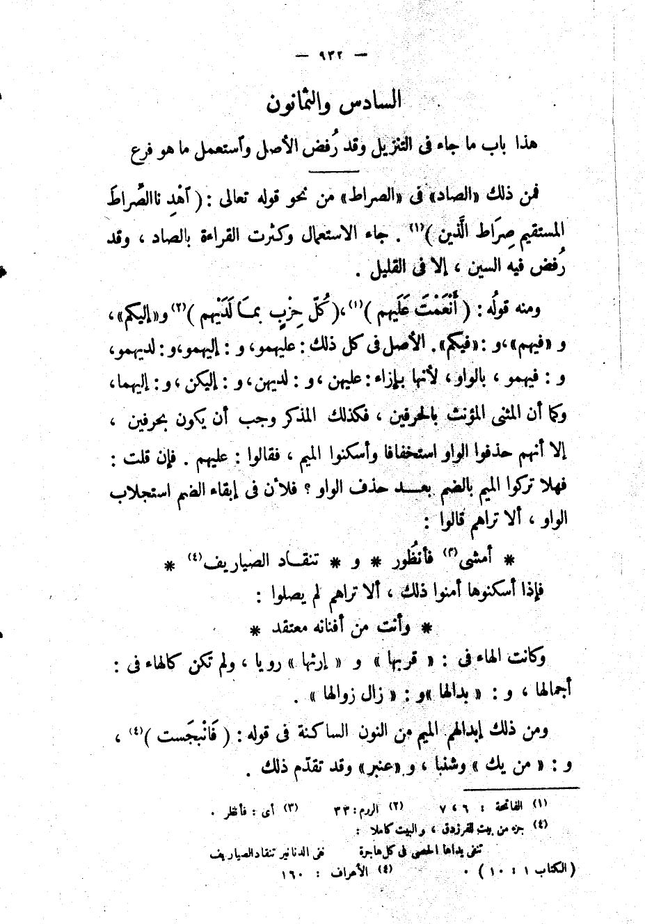 ومنه قوله: (أَنْعَمْتَ عَلَيْهِمْ) «2» ، (كُلُّ حِزْبٍ بِما لَدَيْهِمْ) «3» و «إليكم» ، و «فيهم» ، و: «فيكم» . الأصل فى كل ذلك: عليهم و، و: إليهمو، و: لديهمو، و: فيهمو، بالواو، لأنها بإزاء: عليهن، و: لديهن، و: إليكن، و: إليهما، وكما أن المثنى المؤنث بالحرفين، فكذلك المذكر وجب أن يكون بحرفين، إلا أنهم حذفوا الواو استخفافا وأسكنوا الميم، فقالوا: عليهم. فإن قلت: