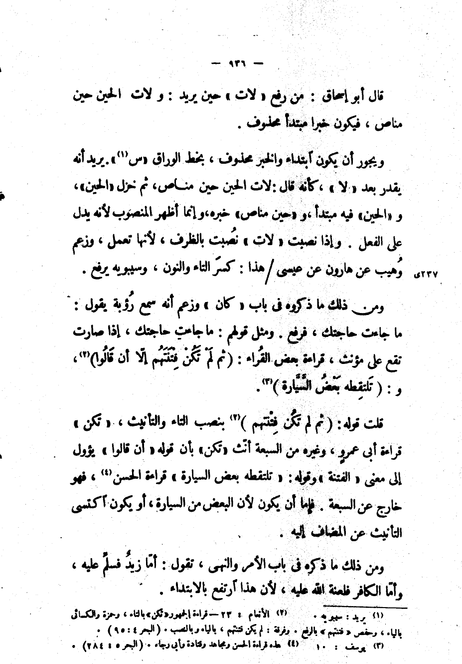 قلت قوله: (ثُمَّ لَمْ تَكُنْ فِتْنَتُهُمْ) «4» بنصب التاء والتأنيث، «تكن» قراءة أبي عمرٍو، وغيره من السبعة أنث «تكن» بأن قوله «أن قالوا» يؤول إلى معنى «الفتنة» وقوله: «تلتقطه بعض السيارة» قراءة الحسن «5» ، فهو خارج عن السبعة. فإما أن يكون لأن البعض من السيارة، أو يكون اكتسى التأنيث عن المضاف إليه.