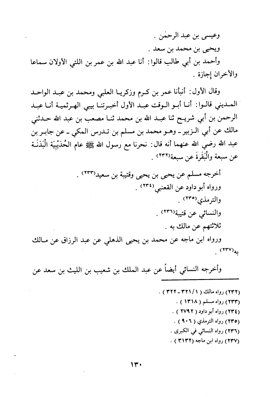 وَقَالَ الأَوَّلُ: أَنْبَأَنَا عُمَرُ بْنُ كَرَمٍ، وَزَكَرِيَّا الْعُلْبِيُّ، وَمُحَمَّدُ بْنُ عَبْدِ الْوَاحِدِ الْمَدِينِيُّ , قَالُوا: أنا أَبُو الْوَقْتِ عَبْدُ الأَوَّلِ، أَخْبَرَتْنَا بِيبِي الْهَرْثَمِيَّةُ، أنا عَبْدُ الرَّحْمَنِ بْنُ أَبِي شُرَيْحٍ، ثنا عَبْدُ اللَّهِ بْنُ مُحَمَّدٍ، ثنا مُصْعَبُ بْنُ عَبْدِ اللَّهِ، حَدَّثَنِي مَالِكٌ، عَنْ أَبِي الزُّبَيْرِ وَهُوَ مُحَمَّدُ بْنُ مُسْلِمِ بْنِ تَدْرُسَ الْمَكِّيُّ , عَنْ جَابِرِ بْنِ عَبْدِ اللَّهِ رَضِيَ اللَّهُ عَنْهُمَا , أَنَّهُ قَالَ: نَحَرْنَا مَعَ رَسُولِ اللَّهِ صَلَّى اللَّهُ عَلَيْهِ وَسَلَّمَ عَامَ الْحُدَيْبِيَةِ الْبَدَنَةَ عَنْ سَبْعَةٍ وَالْبَقَرَةَ عَنْ سَبْعَةٍ.