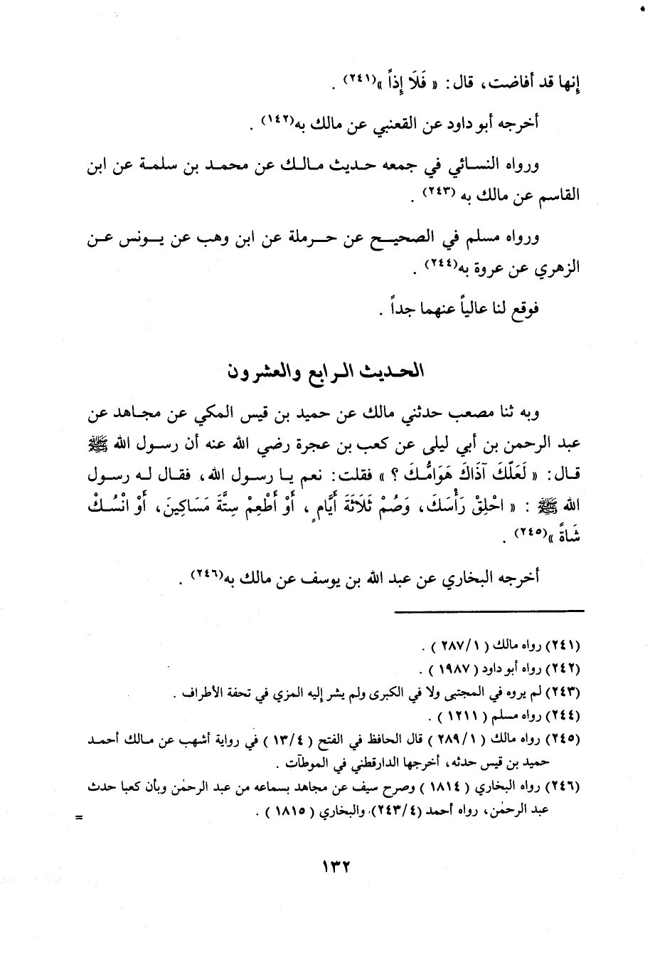 وَبِهِ، ثنا مُصْعَبٌ , حَدَّثَنِي مَالِكٌ، عَنْ حُمَيْدِ بْنِ قَيْسٍ الْمَكِّيِّ، عَنْ مُجَاهِدٍ، عَنْ عَبْدِ الرَّحْمَنِ بْنِ أَبِي لَيْلَى، عَنْ كَعْبِ بْنِ عُجْرَةَ رَضِيَ اللَّهُ عَنْه , أَنَّ رَسُولَ اللَّهِ صَلَّى اللَّهُ عَلَيْهِ وَسَلَّمَ قَالَ: لَعَلَّكَ آذَاكَ هَوَامُّكَ؟ فَقُلْتُ: نَعَمْ يَا رَسُولَ اللَّهِ، فَقَالَ لَهُ رَسُولُ اللَّهِ صَلَّى اللَّهُ عَلَيْهِ وَسَلَّمَ: احْلِقْ رَأْسَكَ، وَصُمْ ثَلاثَةَ أَيَّامٍ، أَوْ أَطْعِمْ سِتَّةَ مَسَاكِينَ، أَوِ انْسُكْ شَاةً.