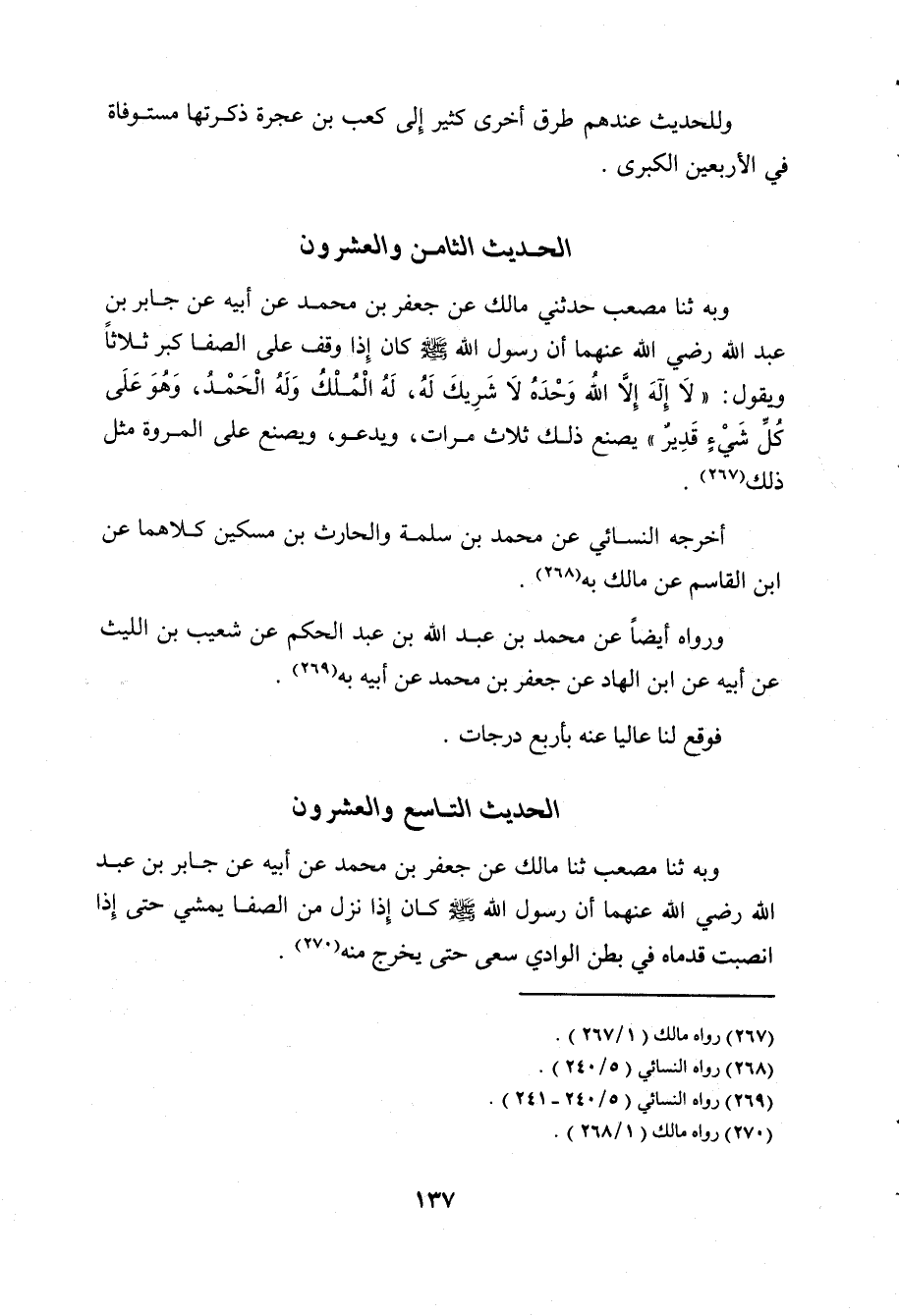 وَبِهِ، ثنا مُصْعَبٌ، حَدَّثَنِي مَالِكٌ، عَنْ جَعْفَرِ بْنِ مُحَمَّدٍ , عَنْ أَبِيهِ، عَنْ جَابِرِ بْنِ عَبْدِ اللَّهِ رَضِيَ اللَّهُ عَنْهُمَا , أَنَّ رَسُولَ اللَّهِ صَلَّى اللَّهُ عَلَيْهِ وَسَلَّمَ كَانَ إِذَا وَقَفَ عَلَى الصَّفَا كَبَّرَ ثَلاثًا وَيَقُولُ: لا إِلَهَ إِلا اللَّهُ وَحْدَهُ لا شَرِيكَ لَهُ، لَهُ الْمُلْكُ وَلَهُ الْحَمْدُ، وَهُوَ عَلَى كُلِّ شَيْءٍ قَدِيرٌ يَصْنَعُ ذَلِكَ ثَلاثَ مَرَّاتٍ، وَيَدْعُو، وَيَصْنَعُ عَلَى الْمَرْوَةِ مِثْلَ ذَلِكَ.