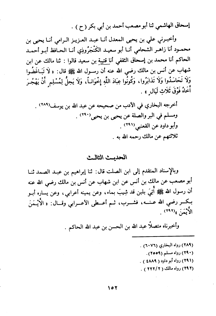 ح وَأَخْبَرَنِي عَلِيُّ بْنُ يَحْيَى الْمُعَدَّلُ، أنا عَبْدُ الْعَزِيزِ الرَّامِي، أنا يَحْيَى بْنُ مَحْمُودٍ، أنا زَاهِرٌ الشَّحَّامِيُّ، أنا أَبُو سَعِيدٍ الْكَنْجَرُوذِيُّ، أنا الْحَافِظُ أَبُو أَحْمَدَ الْحَاكِمُ، أنا مُحَمَّدُ بْنُ إِسْحَاقَ الثَّقَفِيُّ، أنا قُتَيْبَةُ بْنُ سَعِيدٍ , قَالُوا: ثنا مَالِكٌ، عَنِ ابْنِ شِهَابٍ، عَنْ أَنَسِ بْنِ مَالِكٍ رَضِيَ اللَّهُ عَنْه , أَنَّ رَسُولَ اللَّهِ صَلَّى اللَّهُ عَلَيْهِ وَسَلَّمَ قَالَ: لا تَبَاغَضُوا وَلا تَحَاسَدُوا وَلا تَدَابَرُوا، وَكُونُوا عِبَادَ اللَّهِ إِخْوَانًا، وَلا يَحِلُّ لِمُسْلِمٍ أَنْ يَهْجُرَ أَخَاهُ فَوْقَ ثَلاثِ لَيَالٍ.