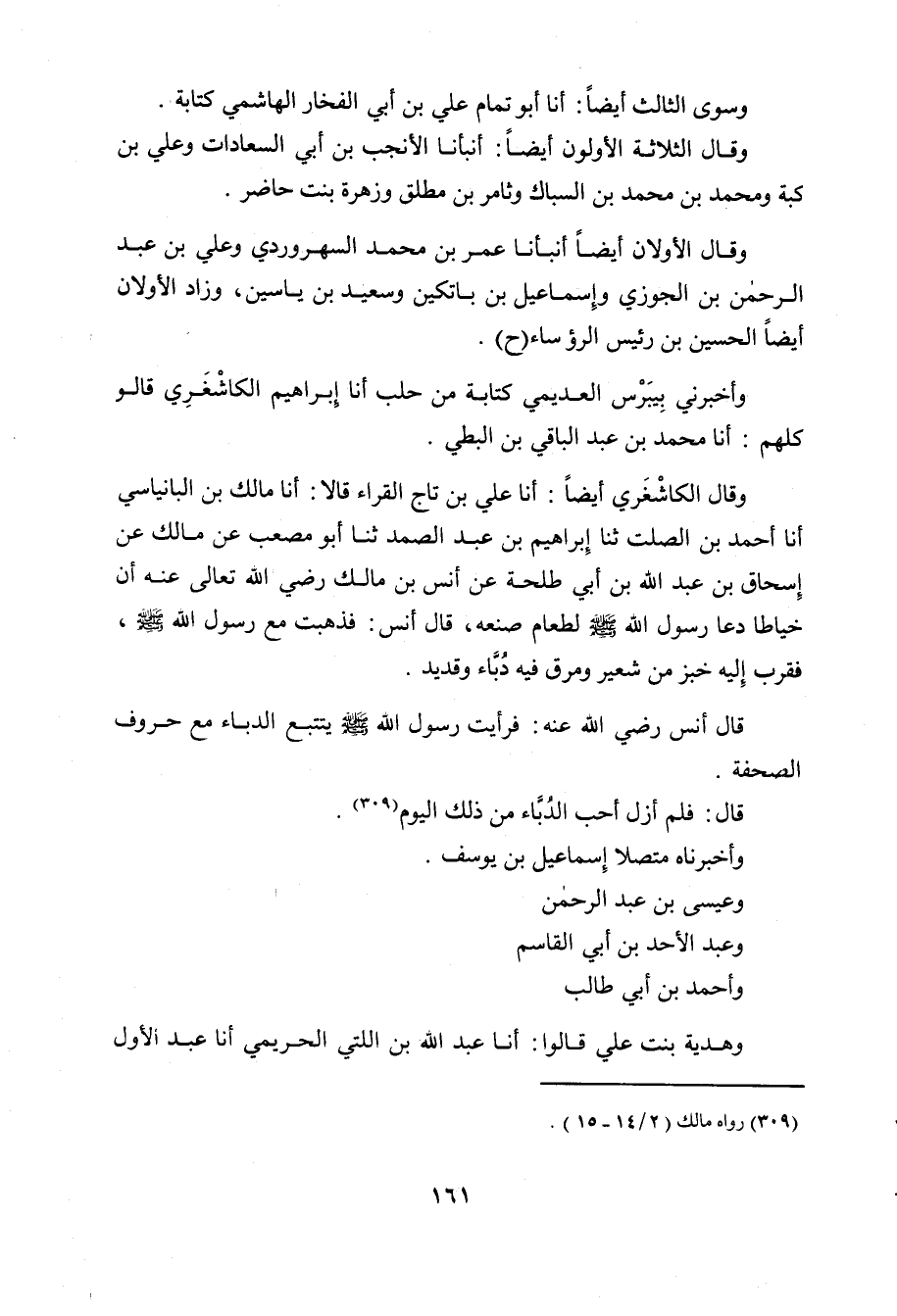 وَقَالَ الْكَاشْغَرِيُّ أَيْضًا: أنا عَلِيُّ بْنُ تَاجِ الْقُرَّاءِ , قَالا: أنا مَالِكُ بْنُ الْبَانِيَاسِيِّ، أنا أَحْمَدُ بْنُ الصَّلْتِ، ثنا إِبْرَاهِيمُ بْنُ عَبْدِ الصَّمَدِ، ثنا أَبُو مُصْعَبٍ، عَنْ مَالِكٍ، عَنْ إِسْحَاقَ بْنِ عَبْدِ اللَّهِ بْنِ أَبِي طَلْحَةَ، عَنْ أَنَسِ بْنِ مَالِكٍ رَضِيَ اللَّهُ تَعَالَى عَنْهُ , أَنَّ خَيَّاطًا دَعَا رَسُولَ اللَّهِ صَلَّى اللَّهُ عَلَيْهِ وَسَلَّمَ لِطَعَامٍ صَنَعَهُ، قَالَ أَنَسٌ: فَذَهَبْتُ مَعَ رَسُولِ اللَّهِ صَلَّى اللَّهُ عَلَيْهِ وَسَلَّمَ، فَقُرِّبَ إِلَيْهِ خُبْزٌ مِنْ شَعِيرٍ وَمَرَقٌ فِيهِ دُبَّاءٌ وَقَدِيدٌ.