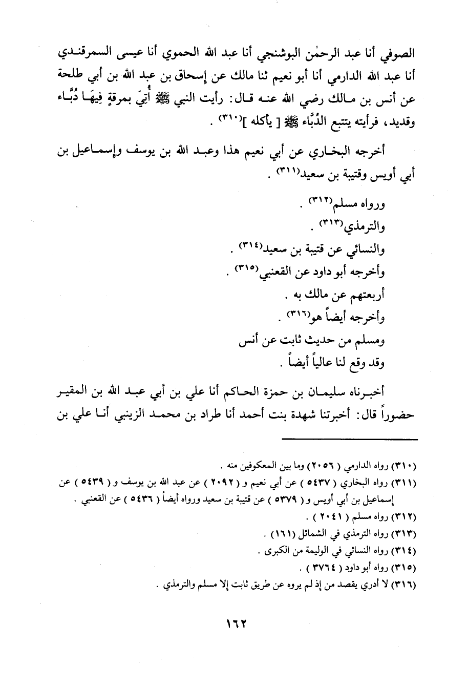 الصُّوفِيُّ، أنا عَبْدُ الرَّحْمَنِ الْبُوشَنْجِيُّ، أنا عَبْدُ اللَّهِ الْحَمَوِيُّ، أنا عِيسَى السَّمَرْقَنْدِيُّ، أنا عَبْدُ اللَّهِ الدَّارِمِيُّ، أنا أَبُو نُعَيْمٍ، ثنا مَالِكٌ، عَنْ إِسْحَاقَ بْنِ عَبْدِ اللَّهِ بْنِ أَبِي طَلْحَةَ، عَنْ أَنَسِ بْنِ مَالِكٍ رَضِيَ اللَّهُ عَنْه , قَالَ: رَأَيْتُ النَّبِيَّ صَلَّى اللَّهُ عَلَيْهِ وَسَلَّمَ أُتِيَ بِمَرَقَةٍ فِيهَا دُبَّاءٌ وَقَدِيدٌ، فَرَأَيْتُهُ يَتَتَبَّعُ الدُّبَّاءَ صَلَّى اللَّهُ عَلَيْهِ وَسَلَّمَ يَأْكُلُهُ.
