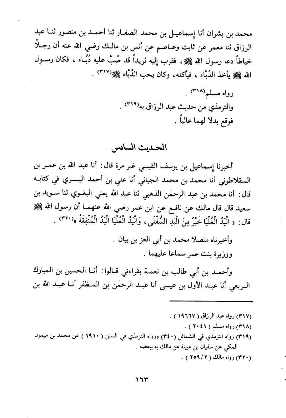 أَخْبَرَنَا إِسْمَاعِيلُ بْنُ يُوسُفَ الْقَيْسِيُّ غَيْرَ مَرَّةٍ , قَالَ: أنا عَبْدُ اللَّهِ بْنُ عُمَرَ بْنِ السَّقْلاطُونِيِّ، أنا مُحَمَّدُ بْنُ مُحَمَّدٍ الْجَيَّانِيُّ، أنا عَلِيُّ بْنُ أَحْمَدَ الْبُسْرِيُّ فِي كِتَابِهِ , قَالَ: أنا مُحَمَّدُ بْنُ عَبْدِ الرَّحْمَنِ الذَّهَبِيُّ، ثنا عَبْدُ اللَّهِ يَعْنِي الْبَغَوِيَّ، ثنا سُوَيْدُ بْنُ سَعِيدٍ , قَالَ: قَالَ مَالِكٌ: عَنْ نَافِعٍ، عَنِ ابْنِ عُمَرَ رَضِيَ اللَّهُ عَنْهُمَا , أَنَّ رَسُولَ اللَّهِ صَلَّى اللَّهُ عَلَيْهِ وَسَلَّمَ قَالَ: الْيَدُ الْعُلْيَا خَيْرٌ مِنَ الْيَدِ السُّفْلَى، وَالْيَدُ الْعُلْيَا الْيَدُ الْمُنْفِقَةُ