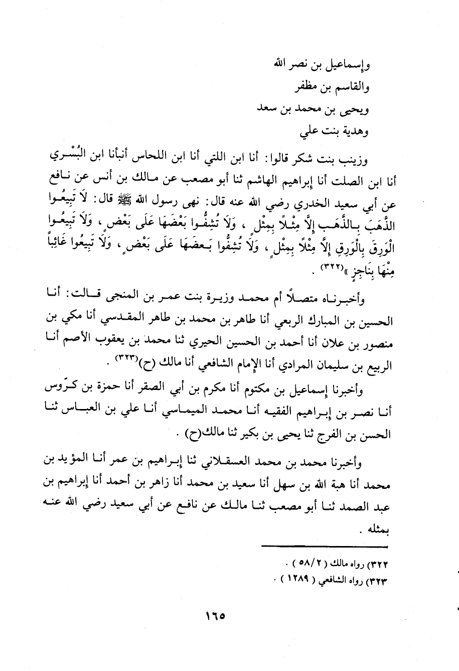 وَإِسْمَاعِيلُ بْنُ نَصْرِ اللَّهِ , وَالْقَاسِمُ بْنُ مُظَفَّرٍ , وَيَحْيَى بْنُ مُحَمَّدِ بْنِ سَعْدٍ , وَهَدِيَّةُ بِنْتُ عَلِيٍّ , وَزَيْنَبُ بِنْتُ شُكْرٍ , قَالُوا: أنا ابْنُ اللُّتِّيِّ، أنا ابْنُ اللَّحَّاسِ، أَنْبَأَنَا ابْنُ الْبُسْرِيِّ، أنا ابْنُ الصَّلْتِ، أنا إِبْرَاهِيمُ الْهَاشِمُ، ثنا أَبُو مُصْعَبٍ، عَنْ مَالِكِ بْنِ أَنَسٍ، عَنْ نَافِعٍ، عَنْ أَبِي سَعِيدٍ الْخُدْرِيِّ رَضِيَ اللَّهُ عَنْه , قَالَ: نَهَى رَسُولُ اللَّهِ صَلَّى اللَّهُ عَلَيْهِ وَسَلَّمَ قَالَ: لا تَبِيعُوا الذَّهَبَ بِالذَّهَبِ إِلا مِثْلا بِمِثْلٍ، وَلا تُشِفُّوا بَعْضَهَا عَلَى بَعْضٍ، وَلا تَبِيعُوا الْوَرِقَ بِالْوَرِقِ إِلا مِثْلا بِمِثْلٍ، وَلا تُشِفُّوا بَعْضَهَا عَلَى بَعْضٍ، وَلا تَبِيعُوا غَائِبًا مِنْهَا بِنَاجِزٍ.