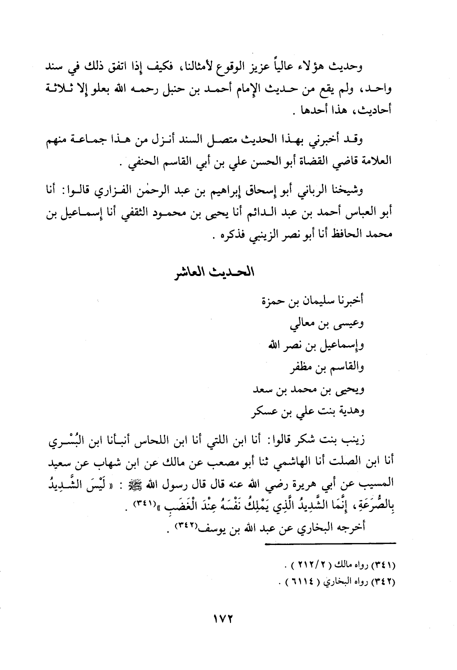 أَخْبَرَنَا سُلَيْمَانُ بْنُ حَمْزَةَ , وَعِيسَى بْنُ مَعَالِي , وَإِسْمَاعِيلُ بْنُ نَصْرِ اللَّهِ , وَالْقَاسِمُ بْنُ مُظَفَّرٍ , وَيَحْيَى بْنُ مُحَمَّدِ بْنِ سَعْدٍ , وَهَدِيَّةُ بِنْتُ عَلِيِّ بْنِ عَسْكَرٍ , وَزَيْنَبُ بِنْتُ شُكْرٍ , قَالُوا: أنا ابْنُ اللُّتِّيِّ، أنا ابْنُ اللَّحَّاسِ، أَنْبَأَنَا ابْنُ الْبُسْرِيِّ، أنا ابْنُ الصَّلْتِ، أنا الْهَاشِمِيُّ، ثنا أَبُو مُصْعَبٍ، عَنْ مَالِكٍ، عَنِ ابْنِ شِهَابٍ، عَنْ سَعِيدِ بْنِ الْمُسَيِّبِ، عَنْ أَبِي هُرَيْرَةَ رَضِيَ اللَّهُ عَنْه , قَالَ: قَالَ رَسُولُ اللَّهِ صَلَّى اللَّهُ عَلَيْهِ وَسَلَّمَ: لَيْسَ الشَّدِيدُ بِالصُّرْعَةِ، إِنَّمَا الشَّدِيدُ الَّذِي يَمْلِكُ نَفْسَهُ عِنْدَ الْغَضَبِ ".