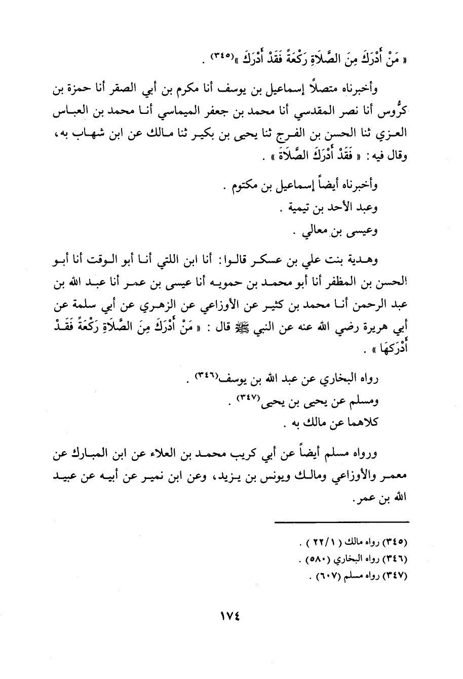 وَأَخْبَرَنَاهُ مُتَّصِلا إِسْمَاعِيلُ بْنُ يُوسُفَ، أنا مُكْرَمُ بْنُ أَبِي الصَّقْرِ، أنا حَمْزَةُ بْنُ كروسٍ، أنا نَصْرٌ الْمَقْدِسِيُّ، أنا مُحَمَّدُ بْنُ جَعْفَرٍ الْمِيمَاسِيُّ، أنا مُحَمَّدُ بْنُ الْعَبَّاسِ الْغَزِّيُّ، ثنا الْحَسَنُ بْنُ الْفَرَجِ، ثنا يَحْيَى بْنُ بُكَيْرٍ، ثنا مَالِكٌ، عَنِ ابْنِ شِهَابٍ بِهِ , وَقَالَ فِيهِ: فَقَدْ أَدْرَكَ الصَّلاةَ