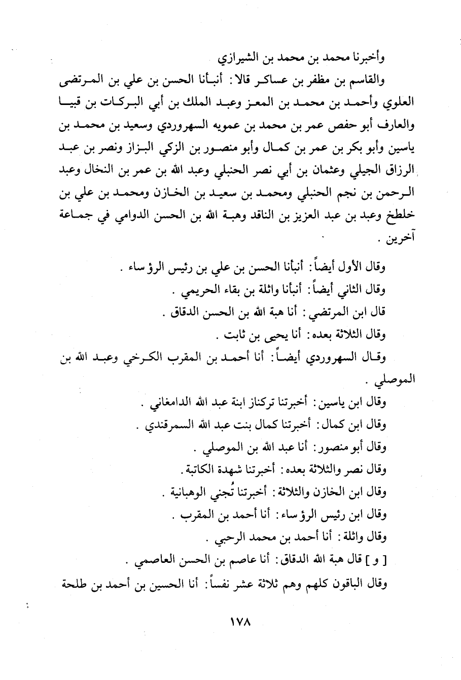 وَالْقَاسِمُ بْنُ مُظَفَّرِ بْنِ عَسَاكِرَ , قَالا: أَنْبَأَنَا الْحَسَنُ بْنُ عَلِيِّ بْنِ الْمُرْتَضَى الْعَلَوِيُّ، وَأَحْمَدُ بْنُ مُحَمَّدِ بْنِ الْمُعِزِّ، وَعَبْدُ الْمَلِكِ بْنُ أَبِي الْبَرَكَاتِ بْنِ قبيا، وَالْعَارِفُ أَبُو حَفْصٍ عُمَرُ بْنُ مُحَمَّدِ بْنِ عَمُّوَيْهِ السُّهْرَوَرْدِيُّ، وَسَعِيدُ بْنُ مُحَمَّدِ بْنِ يَاسِينَ، وَأَبُو بَكْرِ بْنُ عُمَرَ بْنِ كَمَالٍ، وَأَبُو مَنْصُورِ بْنُ الزَّكِيِّ الْبَزَّازُ، وَنَصْرُ بْنُ عَبْدِ الرَّزَّاقِ الْجِيلِيُّ، وَعُثْمَانُ بْنُ أَبِي نَصْرٍ الْحَنْبَلِيُّ، وَعَبْدُ اللَّهِ بْنُ عُمَرَ بْنِ النَّخَّالِ، وَعَبْدُ الرَّحْمَنِ بْنُ نَجْمٍ الْحَنْبَلِيُّ، وَمُحَمَّدُ بْنُ سَعِيدِ بْنِ الْخَازِنِ، وَمُحَمَّدُ بْنُ عَلِيِّ بْنِ خلطخ، وَعَبْدُ بْنُ عَبْدِ الْعَزِيزِ بْنِ النَّاقِدِ، وَهِبَةُ اللَّهِ بْنُ الْحَسَنِ الدَّوَّامِيُّ فِي جَمَاعَةٍ آخَرِينَ.