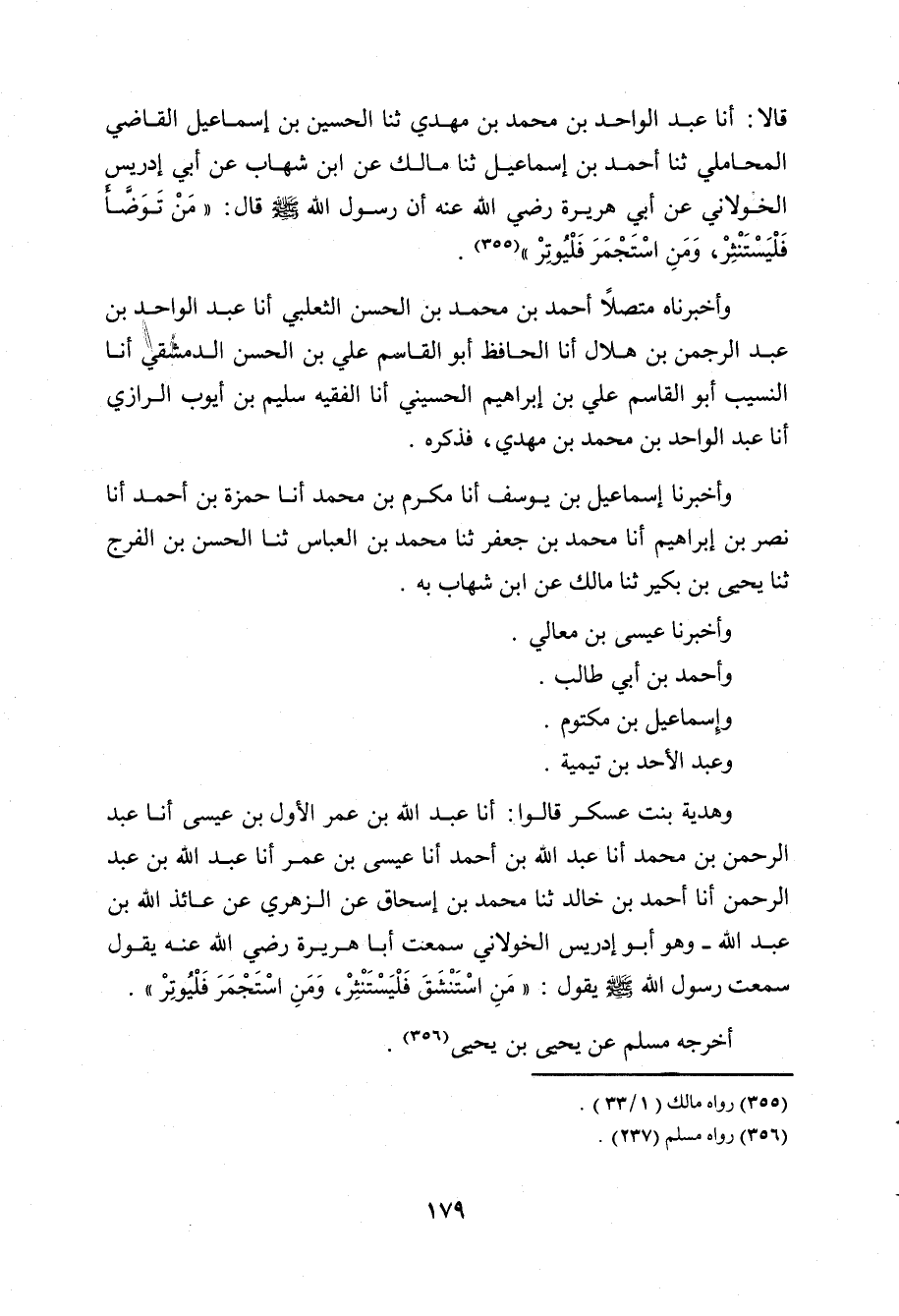 , قَالا: أنا عَبْدُ الْوَاحِدِ بْنُ مُحَمَّدِ بْنِ مَهْدِيٍّ، ثنا الْحُسَيْنُ بْنُ إِسْمَاعِيلَ الْقَاضِي الْمَحَامِلِيُّ، ثنا أَحْمَدُ بْنُ إِسْمَاعِيلَ، ثنا مَالِكٌ، عَنِ ابْنِ شِهَابٍ، عَنْ أَبِي إِدْرِيسَ الْخَوْلانِيِّ، عَنْ أَبِي هُرَيْرَةَ رَضِيَ اللَّهُ عَنْه , أَنَّ رَسُولَ اللَّهِ صَلَّى اللَّهُ عَلَيْهِ وَسَلَّمَ قَالَ: مَنْ تَوَضَّأَ فَلْيَسْتَنْثِرْ وَمَنِ اسْتَجْمَرَ فَلْيُوتِرْ.