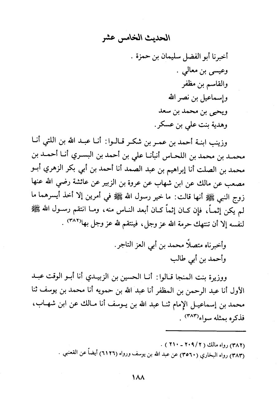 وَوَزِيرَةُ بِنْتُ الْمُنَجَّا , قَالُوا: أنا الْحُسَيْنُ بْنُ الزُّبَيْدِيِّ، أنا أَبُو الْوَقْتِ عَبْدُ الأَوَّلِ، أنا عَبْدُ الرَّحْمَنِ بْنُ الْمُظَفَّرِ، أنا عَبْدُ اللَّهِ بْنُ حَمُّوَيْهِ، أنا مُحَمَّدُ بْنُ يُوسُفَ، ثنا مُحَمَّدُ بْنُ إِسْمَاعِيلَ الإِمَامُ، ثنا عَبْدُ اللَّهِ بْنُ يُوسُفَ، أنا مَالِكٌ، عَنِ ابْنِ شِهَابٍ، فَذَكَرَهُ بِمِثْلِهِ سَوَاءً.
