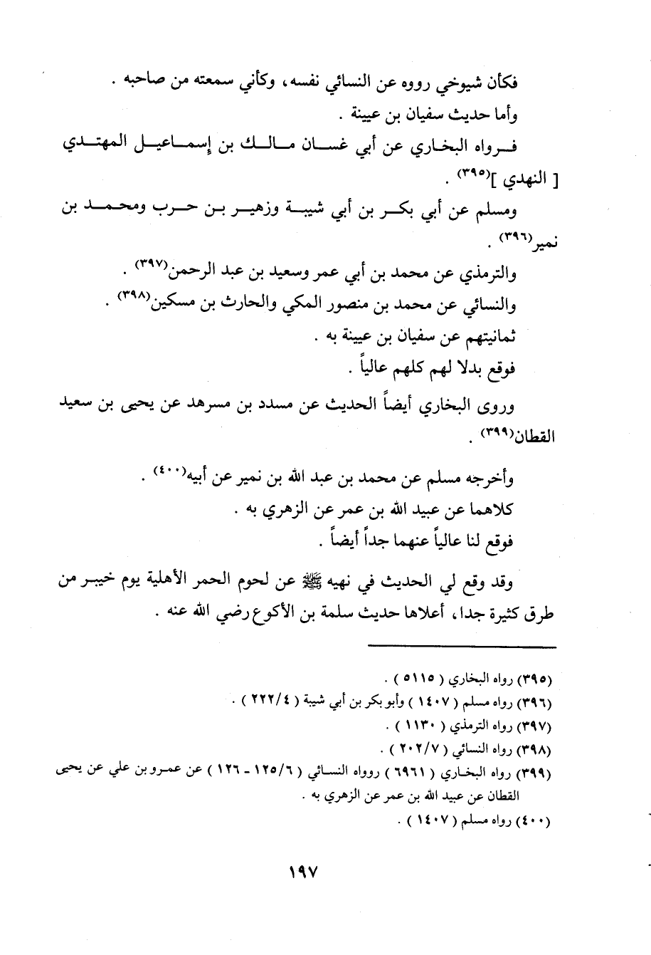 وَقَدْ وَقَعَ لِي الْحَدِيثُ فِي نَهْيِهِ صَلَّى اللَّهُ عَلَيْهِ وَسَلَّمَ عَنْ لُحُومِ الْحُمُرِ الأَهْلِيَّةِ يَوْمَ خَيْبَرَ مِنْ طُرُقٍ كَثِيرَةٍ جِدًّا، أَعْلاهَا حَدِيثُ سَلَمَةَ بْنِ الأَكْوَعِ رَضِيَ اللَّهُ عَنْه.