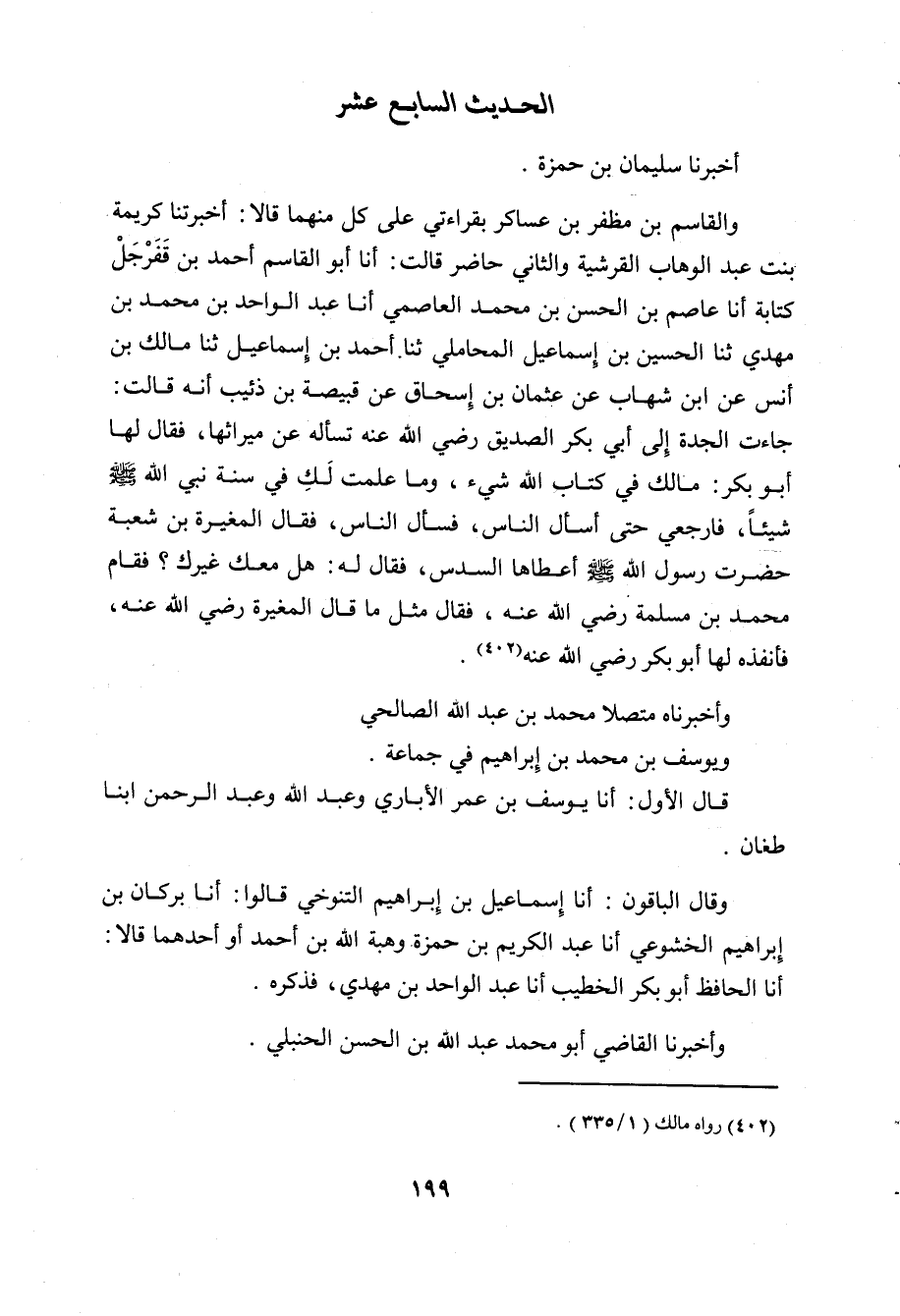 وَالْقَاسِمُ بْنُ مُظَفَّرِ بْنِ عَسَاكِرَ بِقِرَاءَتِي عَلَى كُلٍّ مِنْهُمَا , قَالا: أَخْبَرَتْنَا كَرِيمَةُ بِنْتُ عَبْدِ الْوَهَّابِ الْقُرَشِيَّةُ وَالثَّانِي حَاضِرٌ , قَالَتْ: أنا أَبُو الْقَاسِمِ أَحْمَدُ بْنُ قَفَرْجَل كِتَابَةً، أنا عَاصِمُ بْنُ الْحَسَنِ بْنِ مُحَمَّدٍ الْعَاصِمِيُّ، أنا عَبْدُ الْوَاحِدِ بْنُ مُحَمَّدِ بْنِ مَهْدِيٍّ، ثنا الْحُسَيْنُ بْنُ إِسْمَاعِيلَ الْمَحَامِلِيُّ، ثنا أَحْمَدُ بْنُ إِسْمَاعِيلَ، ثنا مَالِكُ بْنُ أَنَسٍ، عَنِ ابْنِ شِهَابٍ، عَنْ عُثْمَانَ بْنِ إِسْحَاقَ، عَنْ قَبِيصَةَ بْنِ ذُئَيْبٍ أَنَّهُ قَالَتْ: جَاءَتِ الْجَدَّةُ إِلَى أَبِي بَكْرٍ الصِّدِّيقِ رَضِيَ اللَّهُ عَنْه تَسْأَلُهُ عَنْ مِيرَاثِهَا، فَقَالَ لَهَا أَبُو بَكْرٍ: مَا لَكِ فِي كِتَابِ اللَّهِ شَيْءٌ، وَمَا عَلِمْتُ لَكِ فِي سُنَّةِ نَبِيِّ اللَّهِ صَلَّى اللَّهُ عَلَيْهِ وَسَلَّمَ شَيْئًا، فَارْجِعِي حَتَّى أَسْأَلَ النَّاسَ، فَسَأَلَ النَّاسَ، فَقَالَ الْمُغِيرَةُ بْنُ شُعْبَةَ حَضَرْتُ رَسُولَ اللَّهِ صَلَّى اللَّهُ عَلَيْهِ وَسَلَّمَ «أَعْطَاهَا السُّدُسَ» ، فَقَالَ لَهُ: هَلْ مَعَك غَيْرُكَ؟ فَقَامَ مُحَمَّدُ بْنُ مَسْلَمَةَ رَضِيَ اللَّهُ عَنْه، فَقَالَ مِثْلَ مَا قَالَ الْمُغِيرَةُ رَضِيَ اللَّهُ عَنْه، فَأَنْفَذَهُ لَهَا أَبُو بَكْرٍ رَضِيَ اللَّهُ عَنْه.