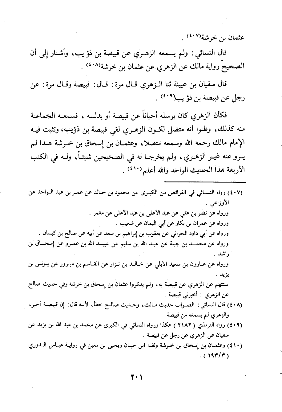 قَالَ النَّسَائِيُّ: وَلَمْ يَسْمَعْهُ الزُّهْرِيُّ عَنْ قَبِيصَةَ بْنِ ذُؤَيْبٍ، وَأَشَارَ إِلَى أَنَّ الصَّحِيحَ رِوَايَةُ مَالِكٍ، عَنِ الزُّهْرِيِّ، عَنْ عُثْمَانَ بْنِ خِرَشَةَ.