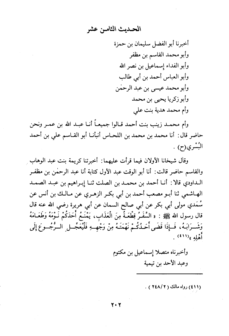 ح وَقَالَ شَيْخَانَا الأَوَّلانِ فِيمَا قَرَأْتُ عَلَيْهِمَا: أَخْبَرَتْنَا كَرِيمَةُ بِنْتُ عَبْدِ الْوَهَّابِ , وَالْقَاسِمُ حَاضِرٌ قَالَتْ: أنا أَبُو الْوَقْتِ عَبْدُ الأَوَّلِ كِتَابَةً، أنا عَبْدُ الرَّحْمَنِ بْنُ مُظَفَّرٍ الدَّاوُدِيُّ , قَالا: أنا أَحْمَدُ بْنُ مُحَمَّدِ بْنِ الصَّلْتِ، ثنا إِبْرَاهِيمُ بْنُ عَبْدِ الصَّمَدِ الْهَاشِمِيُّ، ثنا أَبُو مُصْعَبٍ أَحْمَدُ بْنُ أَبِي بَكْرٍ الزُّهْرِيُّ، عَنْ مَالِكِ بْنِ أَنَسٍ، عَنْ سُمَيٍّ مَوْلَى أَبِي بَكْرٍ، عَنْ أَبِي صَالِحٍ السَّمَّانِ، عَنْ أَبِي هُرَيْرَةَ رَضِيَ اللَّهُ عَنْه , قَالَ: قَالَ رَسُولُ اللَّهِ صَلَّى اللَّهُ عَلَيْهِ وَسَلَّمَ: السَّفَرُ قِطْعَةٌ مِنَ الْعَذَابِ، يَمْنَعُ أَحَدَكُمْ نَوْمَهُ وَطَعَامَهُ وَشَرَابَهُ، فَإِذَا قَضَى أَحَدُكُمْ نَهْمَتَهُ مِنْ وَجْهِهِ فَلْيُعَجِّلِ الرُّجُوعَ إِلَى أَهْلِهِ.