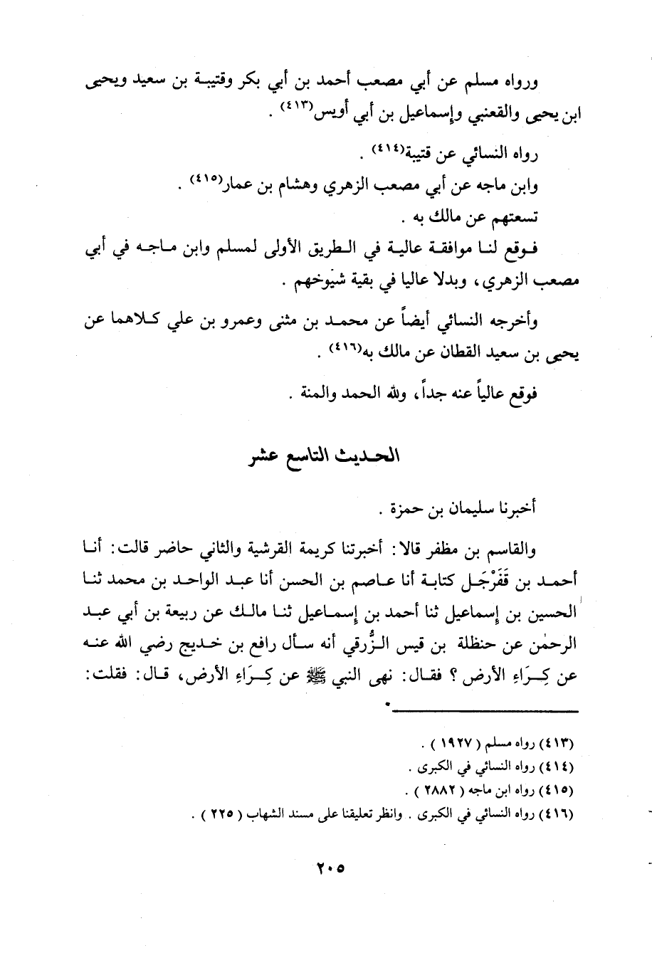 فَوَقَعَ لَنَا مُوَافَقَةً عَالِيَةً فِي الطَّرِيقِ الأُولَى لِمُسْلِمٍ وَابْنِ مَاجَهْ فِي أَبِي مُصْعَبٍ الزُّهْرِيِّ، وَبَدَلا عَالِيًا فِي بَقِيَّةِ شُيُوخِهِمْ.