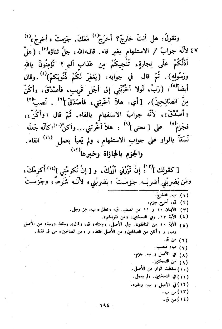 فإن أتيت بالفاء في الجواب نصبت فتقول أأنت خارج فنخرج معك قال سبحانه ( رب لولا أخرتني إلى أجل قريب فأصدق وأكن من الصالحين ) أي هلا أخرتني فأصدق نصب أصدق لأنه جواب الاستفهام بالفاء ثم قال وأكن فجزم على معنى هلا أخرتني وأكن كأنه جعله نسقا بالواو على جواب الاستفهام ولم يعبأ بعمل الفاء