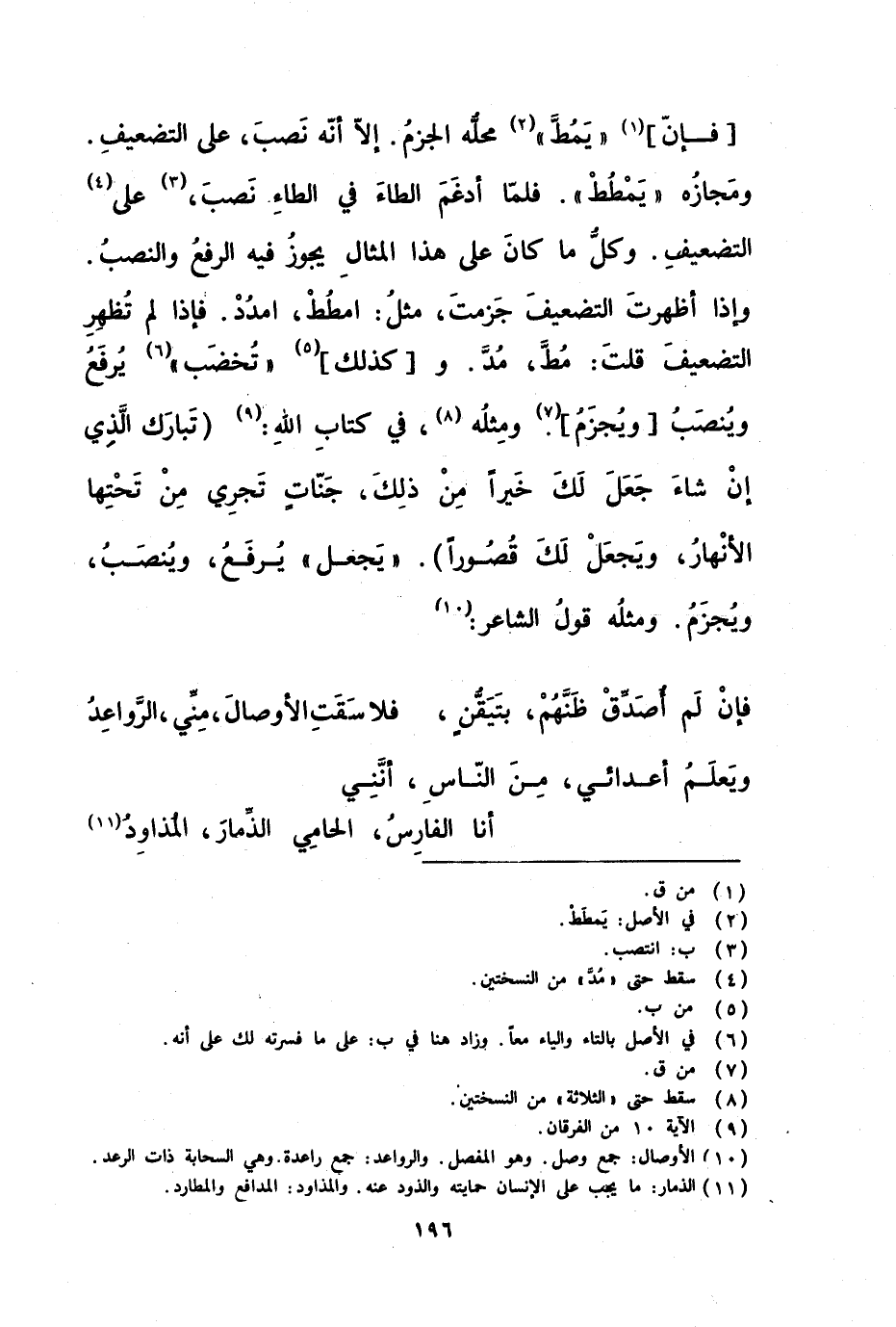 فإن يمط محله الجزم إلا أنه نصب على التضعيف ومجازه يمطط فلما أدغم الطاء في الطاء نصب على التضعيف وكل ما كان على هذا المثال يجوز فيه الرفع والنصب وإذا أظهرت التضعيف جزمت مثل امطط امدد فإذا لم تظهر التضعيف قلت مط مد وكذلك تخضب على ما فسرته لك على أنه يرفع وينصب ويجزم