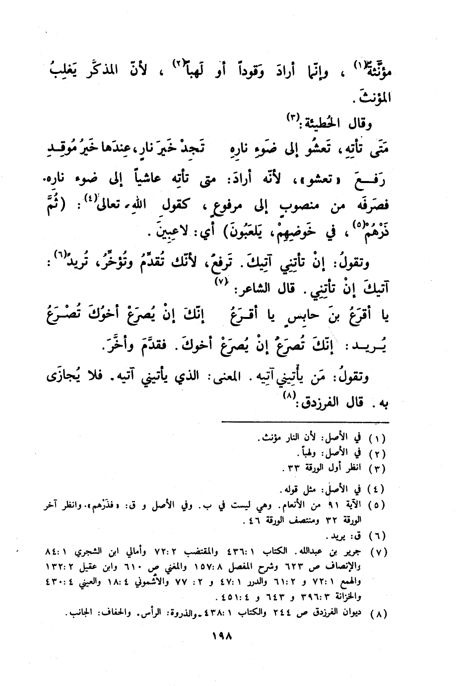 ( متى تأته تعشو إلى ضوء ناره ... تجد خير نار عندها خير موقد ) رفع تعشو لأنه أراد متى تأته عاشيا إلى ضوء ناره فصرفه من منصوب إلى مرفوع كقول الله تعالى ( ثم ذرهم في خوضهم يلعبون ) أي لاعبين