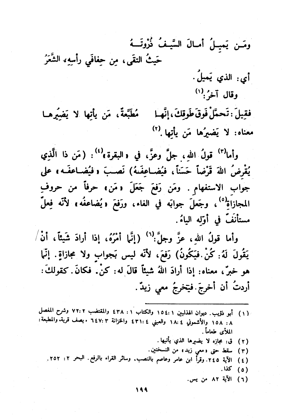 وأما قول الله جل وعز في البقرة ( من ذا الذي يقرض الله قرضا حسنا فيضاعفه ) نصب فيضاعفه على جواب الاستفهام ومن رفع جعل من حرفا من حروف المجازاة وجعل جوابه في الفاء ورفع يضاعفه لأنه فعل مستأنف في أوله الياء