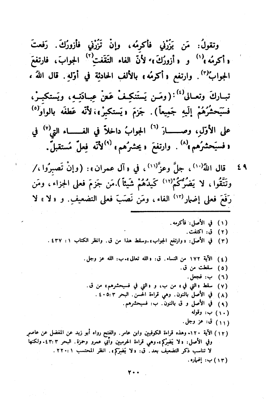 وتقول من يزرني فأكرمه وإن تزرني فأزورك رفعت أكرمه وأزورك لأن الفاء التقفت الجواب فارتفع الجواب وارتفع أكرمه بالألف الحادثة في أوله قال الله تبارك وتعالى ( ومن يستنكف عن عبادته