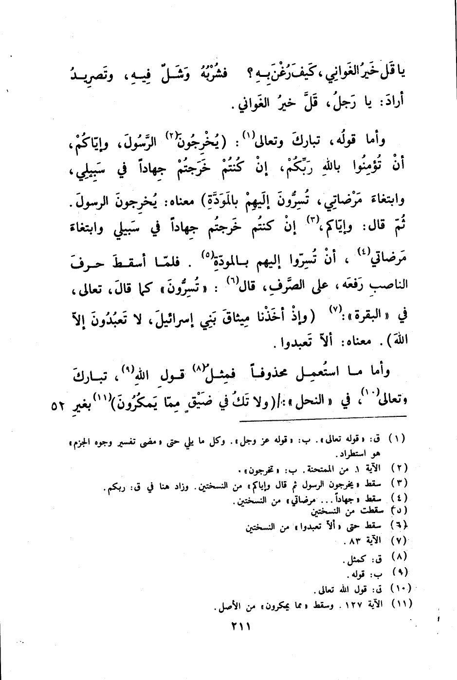 وأما قوله تبارك وتعالى ( يخرجون الرسول وإياكم أن تؤمنوا بالله ربكم إن كنتم خرجتم جهادا في سبيلي وابتغاء مرضاتي تسرون إليهم بالمودة ) معناه يخرجون الرسول ثم قال وإياكم إن كنتم خرجتم جهادا في سبيلي وابتغاء مرضاتي أن تسروا إليهم بالمودة فلما أسقط حرف الناصب رفعه على الصرف قال تسرون كما قال تعالى في البقرة ( وإذ أخذنا ميثاق بني إسرائيل لا تعبدون إلا الله ) معناه ألا تعبدوا