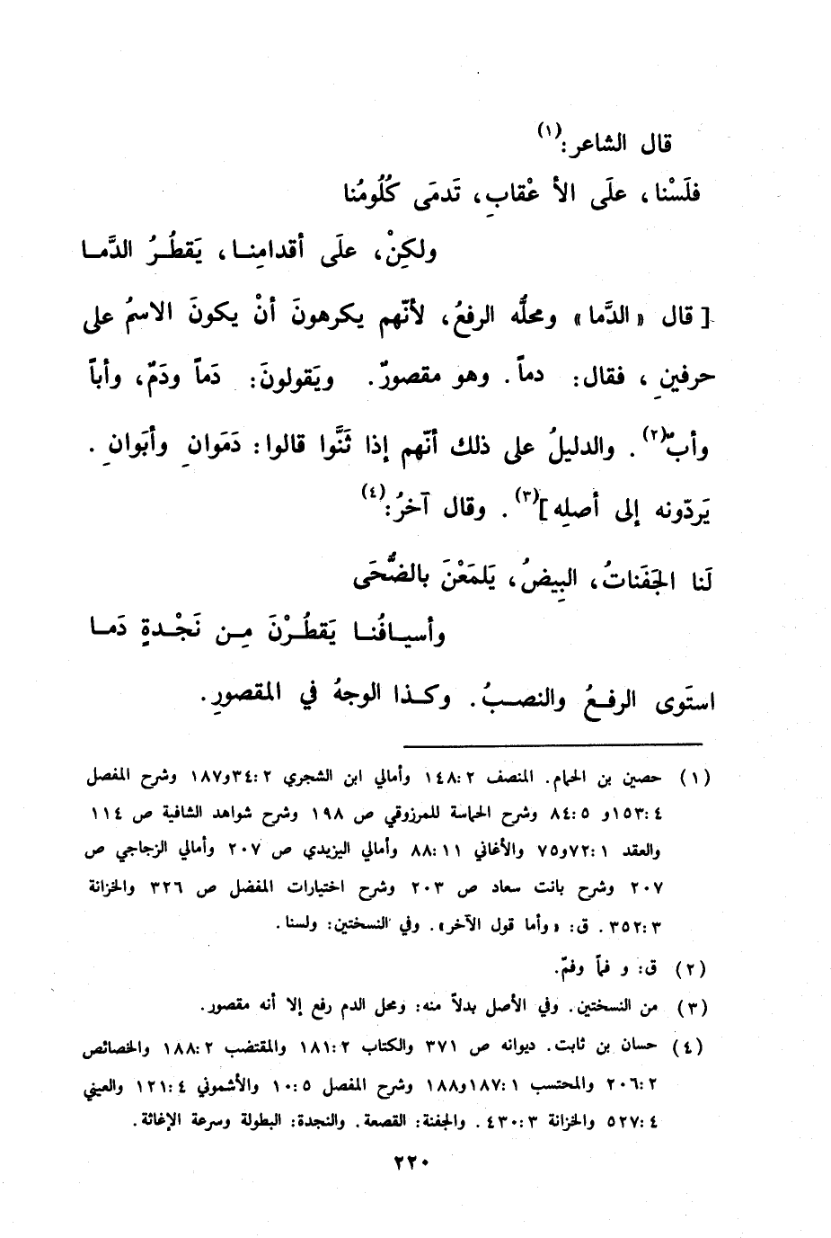 قال الدما ومحله الرفع لأنهم يكرهون أن يكون الاسم على حرفين فقال دما وهو مقصور ويقولون دما ودم وأبا وأب والدليل على ذلك أنهم إذا ثنوا قالوا دموان وأبوان يردونه إلى أصله وقال آخر