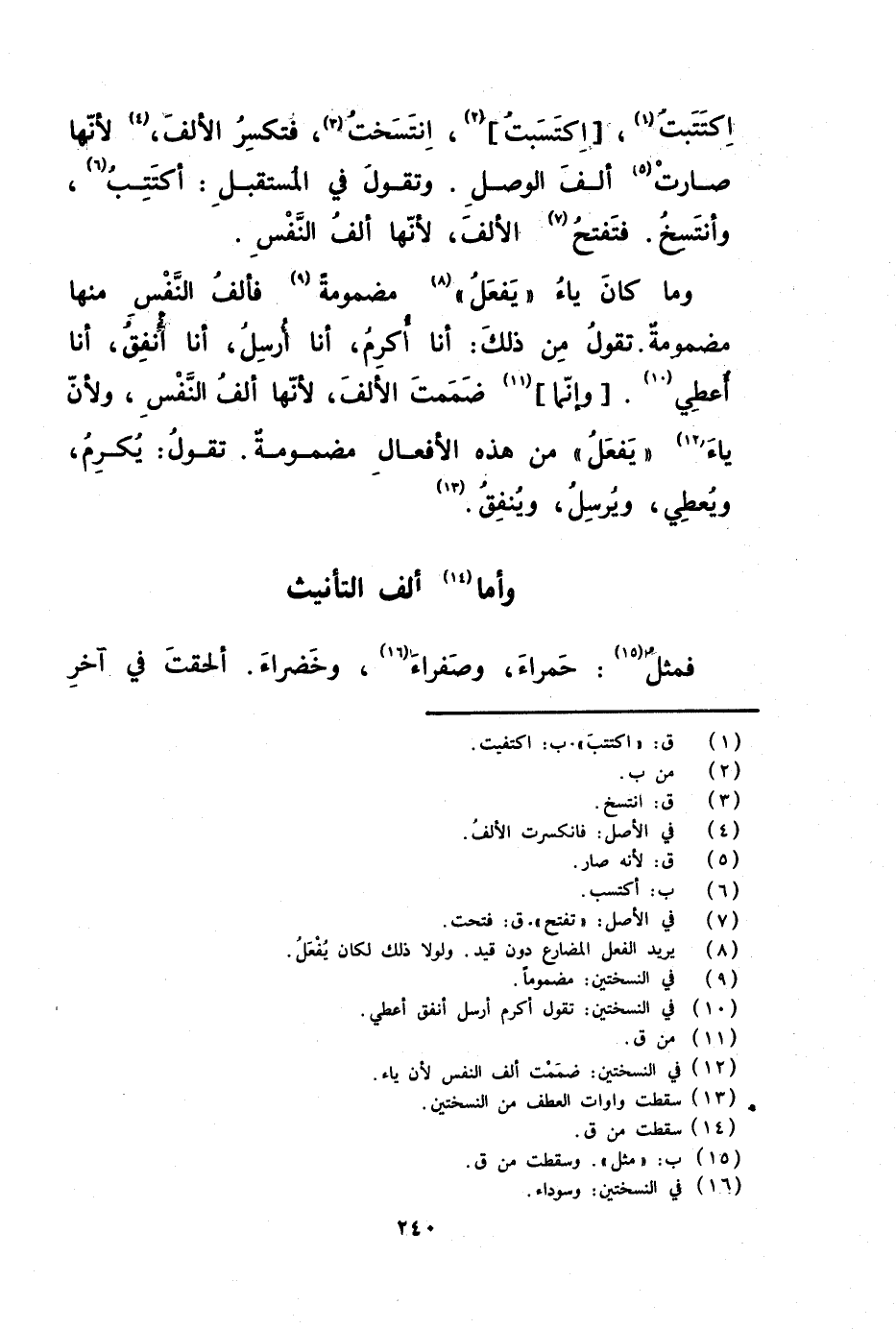 اكتتب اكتسب انتسخت فتكسر الألف لأنها صارت ألف الوصل وتقول في المستقبل اكتتب وانتسخ واكتسب فتفسخ الألف لأنها ألف النفس وما كان ياء يفعل مضمومة فألف النفس منها مضمومة تقول من ذلك أنا أكرم أنا أرسل أنا أنفق أنا أعطي وإنما ضممت الألف لأنها ألف النفس ولأن ياء يفعل من هذه الأفعال مضمومة تقول يكرم ويعطي ويرسل وينفق