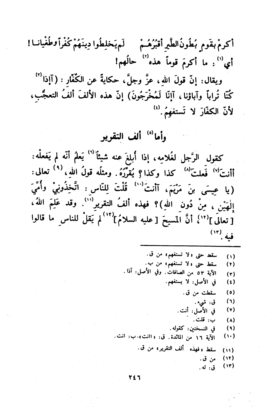 قلت للناس اتخذوني وأمي الهين من دون الله ) فهذه ألف التقرير وقد علم الله تعالى أن المسيح عليه السلام لم يقل للناس ما قالوا فيه