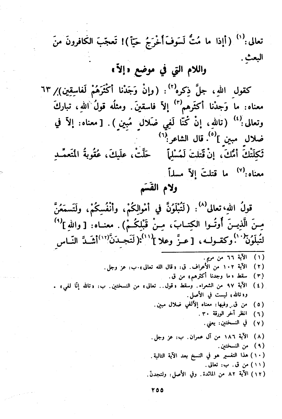كقول الله جل ذكره ( وإن وجدنا أكثرهم لفاسقين ) معناه ما وجدنا أكثرهم إلا فاسقين ومثله قول الله تبارك وتعالى ( تا الله إن كنا لفي ضلال مبين ) معناه إلا في ضلال مبين قال الشاعر ( ثكلتك أمك إن قتلت لمسلما ... حلت عليك عقوبة المتعمد ) معناه ما قتلت إلا مسلما