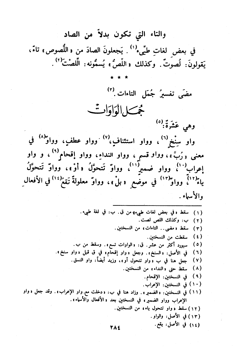 واو سنخ وواو استئناف وواو عطف وواو في معنى رب وواو قسم وواو النداء وواو إقحام وواو إعراب وواو ضمير وواو تتحول أو وواو تتحول ياء وواو في موضع بل وواو معلولة تقع في الأسماء والأفعال
