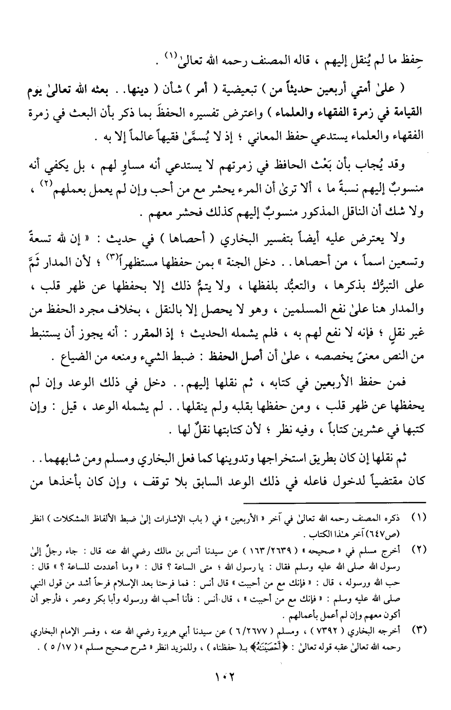 (على أمتي أربعين حديثًا من) تبعيضية (أمر) شأن (دينها. . بعثه اللَّه تعالى يوم القيامة في زمرة الفقهاء والعلماء) واعترض تفسيره الحفظَ بما ذكر بأن البعث في زمرة الفقهاء والعلماء يستدعي حفظ المعاني؛ إذ لا يُسمَّى فقيهًا عالمًا إلا به.