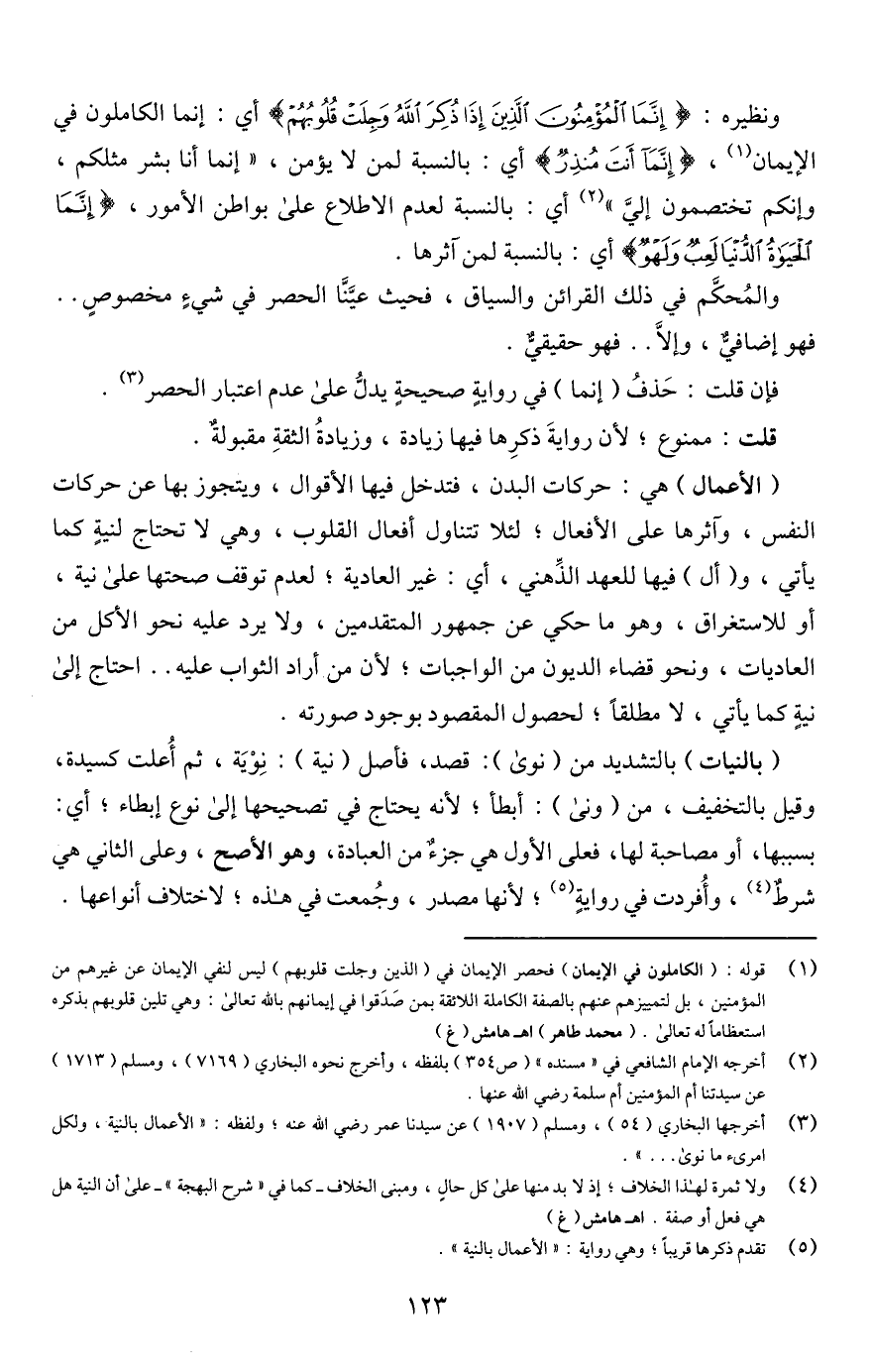 (الأعمال) هي: حركات البدن، فتدخل فيها الأقوال، ويتجوز بها عن حركات النفس، وآثرها على الأفعال؛ لئلا تتناول أفعال القلوب، وهي لا تحتاج لنيةٍ كما يأتي، و (أل) فيها للعهد الذِّهني، أي: غير العادية؛ لعدم توقف صحتها على نية، أو للاستغراق، وهو ما حكي عن جمهور المتقدمين، ولا يرد عليه نحو الأكل من العاديات، ونحو قضاء الديون من الواجبات؛ لأن من أراد الثواب عليه. . احتاج إلى نيةٍ كما يأتي، لا مطلقًا؛ لحصول المقصود بوجود صورته.