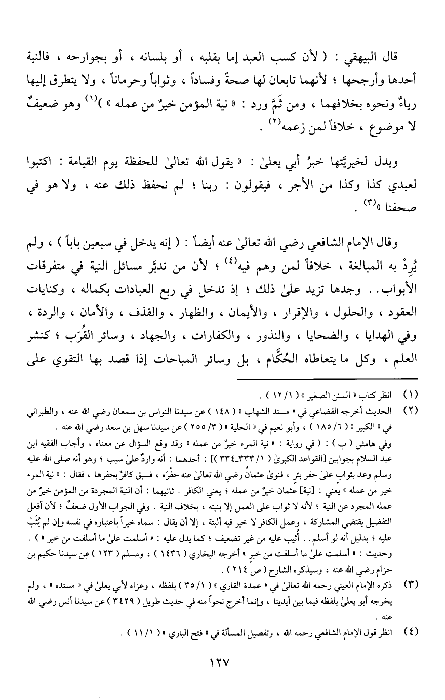 وفي هامش (ب): (في رواية: "نية المرء خيرٌ من عمله" وقد وقع السؤال عن معناه، وأجاب الفقيه ابن عبد السلام بجوابين [القواعد الكبرى (1/ 333 - 334)]: أحدهما: أنه وارد على سبب؛ وهو أنه صلى اللَّه عليه وسلم وعد بثوابٍ على حفر بئرٍ، فنوى عثمانُ رضي اللَّه تعالى عنه حفْرَه، فسبق كافرٌ بحفرها، فقال: "نية المرء خير من عمله" يعني: [نية] عثمان خيرٌ من عمله؛ يعني الكافر. ثانيهما: أن النية المجردة من المؤمن خيرٌ من عمله المجرد عن النية؛ لأنه لا ثواب على العمل إلا بنيته، بخلاف النية. وفي الجواب الأول ضعفٌ؛ لأن أفعل التفضيل يقتضي المشاركة، وعمل الكافر لا خير فيه ألبتة، إلا أن يقال: سماه خيرًا باعتباره في نفسه وإن لم يُثَبْ عليه؛ بدليل أنه لو أسلم. . أُثيب عليه من غير تضعيف؛ كما يدل عليه: "أسلمت على ما أسلفت من خير"). وحديث: "أسلمت على ما أسلقت من خيرٍ" أخرجه البخاري (1436)، ومسلم (123) عن سيدنا حكيم بن حزام رضي اللَّه عنه، وسيذكره الشارح (ص 214).