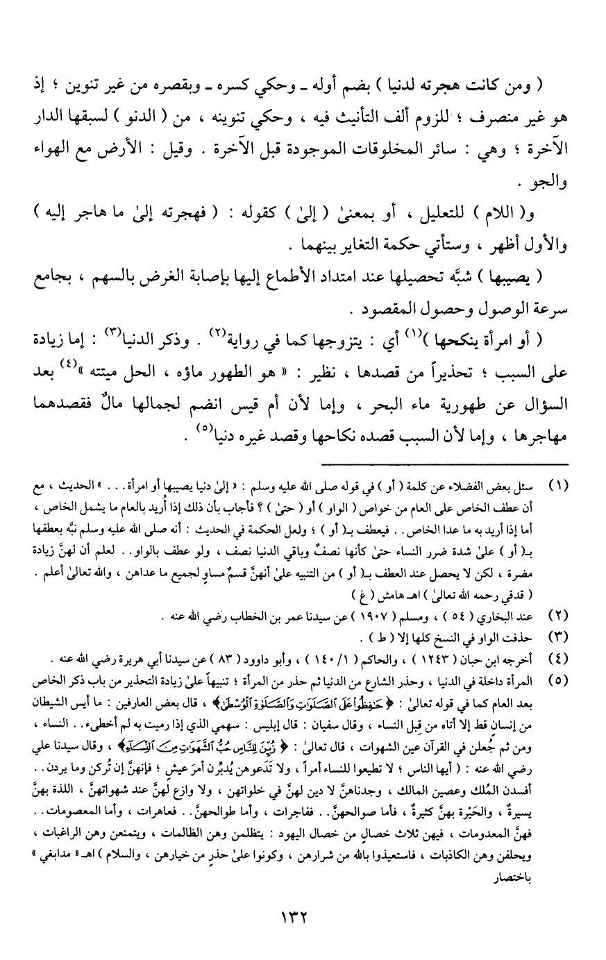 (¬1) سئل بعض الفضلاء عن كلمة (أو) في قوله صلى اللَّه عليه وسلم: "إلى دنيا يصيبها أو امرأة. . . " الحديث، مع أن عطف الخاص على العام من خواص (الواو) أو (حتى)؛ فأجاب بأن ذلك إذا أُريد بالعام ما يشمل الخاص، أما إذا أريد به ما عدا الخاص. . فيعطف بـ (أو)؛ ولعل الحكمة في الحديث: أنه صلى اللَّه عليه وسلم نبَّه بعطفها بـ (أو) على شدة ضرر النساء حتى كأنها نصفٌ وباقي الدنيا نصف، ولو عطف بالواو. . لعلم أن لهنَّ زيادة مضرة، لكن لا يحصل عند العطف بـ (أو) من التنبيه على أنهنَّ قسم مساوٍ لجميع ما عداهن، واللَّه تعالى أعلم. (قدقي رحمه اللَّه تعالى) اهـ هامش (غ)