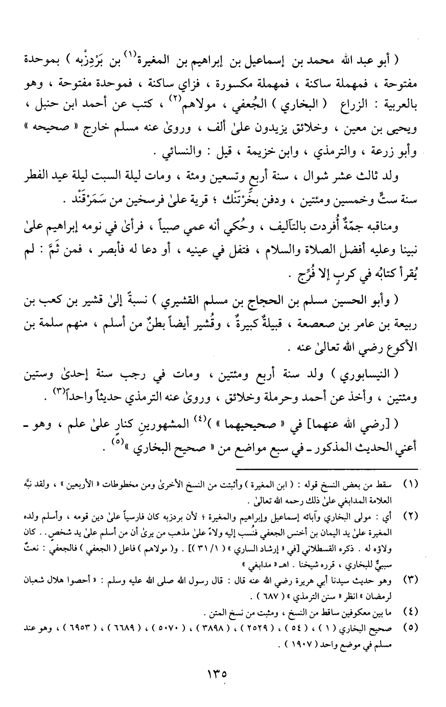 (أبو عبد اللَّه محمد بن إسماعيل بن إبراهيم بن المغيرة (¬1) بن بَرْدِزْبه) بموحدة مفتوحة، فمهملة ساكنة، فمهملة مكسورة، فزاي ساكنة، فموحدة مفتوحة، وهو بالعربية: الزراع (البخاري) الجُعفي، مولاهم (¬2)، كتب عن أحمد ابن حنبل، ويحيى بن معين، وخلائق يزيدون على ألف، وروى عنه مسلم خارج "صحيحه" وأبو زرعة، والترمذي، وابن خزيمة، قيل: والنسائي.