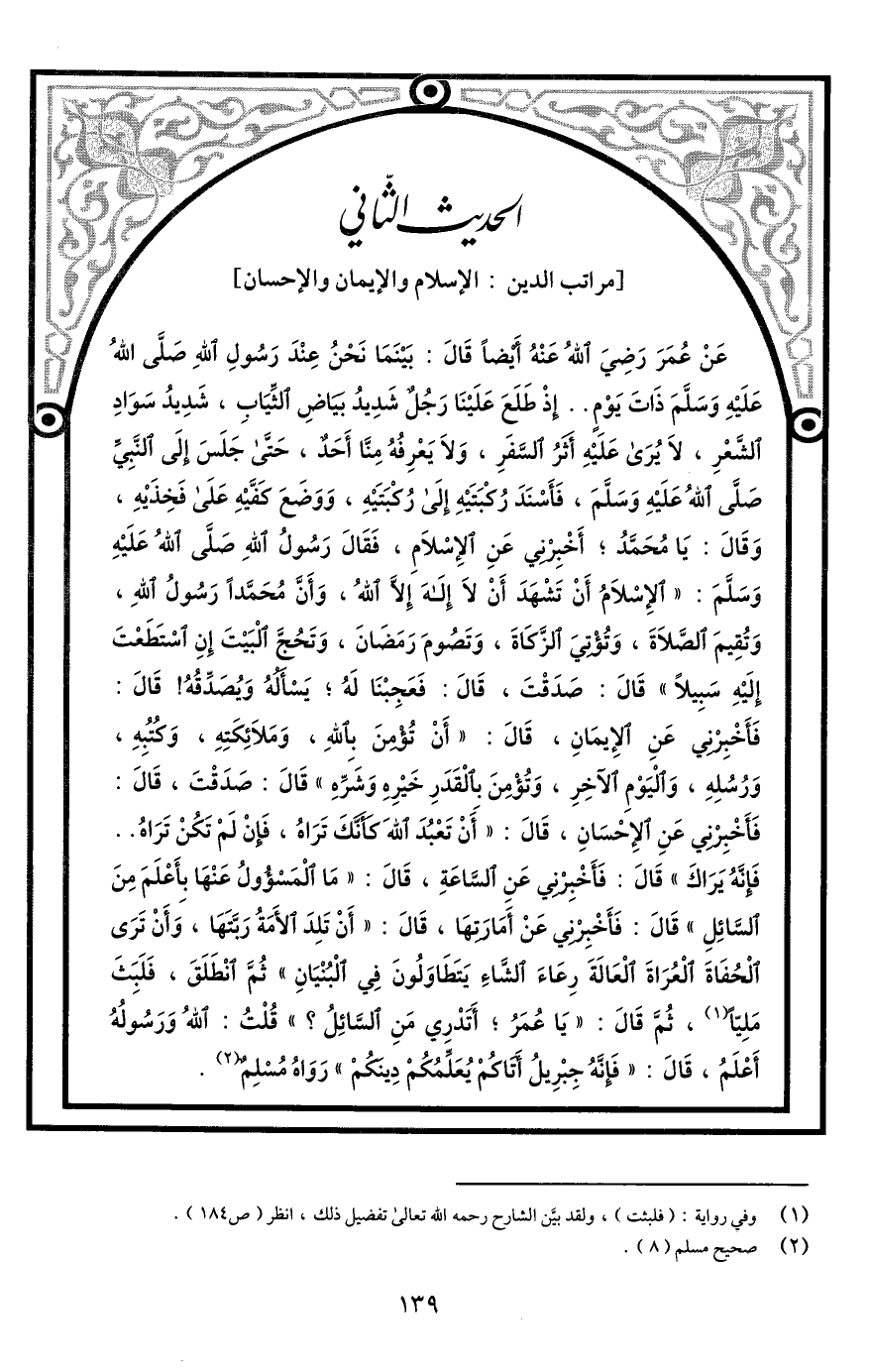 عَنْ عُمَرَ رَضِيَ اللَّهُ عَنْهُ أَيْضًا قَالَ: بَيْنَمَا نَحْنُ عِنْدَ رَسُولِ اللَّهِ صَلَّى اللَّهُ عَلَيْهِ وَسَلَّمَ ذَاتَ يَوْمٍ. . إِذْ طَلَعَ عَلَيْنَا رَجُلٌ شَدِيدُ بيَاضِ الثِّيَابِ، شَدِيدُ سَوَادِ الشَّعْرِ، لَا يُرَي عَلَيْهِ أَثَرُ السَّفَرِ، وَلَا يَعْرِفُهُ مِنَّا أَحَدٌ، حَتَّى جَلَسَ إِلَى النَّبِيِّ صَلَّى اللَّهُ عَلَيْهِ وَسَلَّمَ، فَأَسْنَدَ رُكْبَتَيْهِ إلَى رُكْبَتَيْهِ، وَوَضَعَ كَفَّيْهِ عَلَى فَخِذَيْهِ، وَقَالَ: يَا مُحَمَّدُ؛ أَخْبِرْنِي عَنِ الإِسلَامِ، فَقَالَ رَسُولُ اللَّهِ صَلَّى اللَّهُ عَلَيْهِ وَسَلَّمَ: "الإِسْلَامُ أَنْ تَشْهَدَ أَنْ لَا إلَهَ إِلَّا اللَّهُ، وَأَنَّ مُحَمَّدًا رَسُولُ اللَّهِ، وَتُقِيمَ الصَّلَاةَ، وتُؤْتِيَ الزَّكَاةَ، وَتَصُومَ رَمَضَانَ، وَتَحُجَّ الْبَيْتَ إِنِ اسْتَطَعْتَ إِلَيْهِ سَبِيلًا" قَالَ: صَدَقْتَ، قَالَ: فَعَجِبْنَا لَهُ؛ يَسْأَلُهُ وَيُصَدِّقُهُ! قَالَ: فَأَخْبِرْنِي عَنِ الإِيمَانِ، قَالَ: "أَنْ تُؤْمِنَ بِاللَّهِ، وَمَلَائِكَتِهِ، وَكُتُبِهِ، وَرُسُلِهِ، وَالْيَوْمِ الآخِرِ، وَتُؤْمِنَ بالْقَدَرِ خَيْرِهِ وَشَرِّه "قَالَ: صَدَقْتَ، قَالَ: فَأَخْبِرْنِي عَنِ الإِحْسَانِ، قَالَ: "أَنْ تَعْبُدَ اللَّهَ كَأَنَّكَ تَرَاهُ، فَإِنْ لَمْ تَكُنْ تَرَاهُ. . فَإنَّهُ يَرَاكَ" قَالَ: فَأَخْبِرْنِي عَنِ السَّاعَةِ، قَالَ: "مَا الْمَسْؤُولُ عَنْهَا بأَعْلَمَ مِنَ السَّائِلِ" قَالَ: فَأَخْبِرْنِي عَنْ أَمَارَتهَا، قَالَ: "أَنْ تَلِدَ الأَمَةُ رَبَّتَهَا، وَأَنْ تَرَى الْحُفَاةَ الْعُرَاةَ الْعَالَةَ رِعَاءَ الشَّاءِ يَتَطَاوَلُونَ فِي الْبُنْيَانِ" ثُمَّ انْطَلَقَ، فَلَبِثَ مَلِيًّا (¬1)، ثُمَّ قَالَ: " يَا عُمَرُ؛ أَتَدْرِي مَنِ السَّائِلُ؟ " قُلْتُ: اللَّهُ وَرَسُولُهُ أَعْلَمُ، قَالَ: "فَإِنَّهُ جِبْرِيلُ أَتَاكُمْ يُعَلِّمُكُمْ دِينَكُمْ" رَوَاهُ مُسْلِمٌ (¬2).