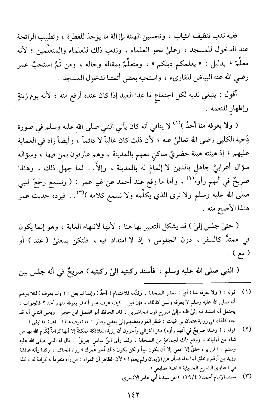 (ولا يعرفه منا أحدٌ) (¬1) لا ينافي أنه كان يأتي النبي صلى اللَّه عليه وسلم في صورة دحية الكلبي رضي اللَّه تعالى عنه؛ لأن ذلك كان غالبًا لا دائمًا، وأيضًا زاد في العماية عليهم؛ إذ هيئته هيئة حضريٍّ ساكنٍ معهم بالمدينة، وهم عارفون بمن فيها، وسؤاله سؤال أعرابيٍّ جاهلٍ بالدين لا إلمامَ له بالمدينة، وإلَّا. . لما جهل ذلك، وهذا صريحٌ في أنهم رأوه (¬2)، وأما ما وقع عند أحمد عن غير عمر: (ونسمع رجْعَ النبي صلى اللَّه عليه وسلم ولا نرى الذي يكلِّمه ولا نسمع كلامه) (¬3). . فيرده حديث عمر هذا الأصح منه.