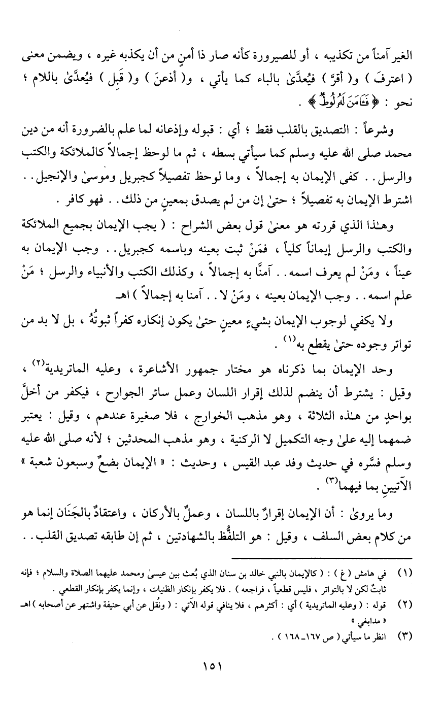 وحد الإيمان بما ذكرناه هو مختار جمهور الأشاعرة، وعليه الماتريدية (¬2)، وقيل: يشترط أن ينضم لذلك إقرار اللسان وعمل سائر الجوارح، فيكفر من أخلَّ بواحدٍ من هذه الثلاثة، وهو مذهب الخوارج، فلا صغيرة عندهم، وقيل: يعتبر ضمهما إليه على وجه التكميل لا الركنية، وهو مذهب المحدثين؛ لأنه صلى اللَّه عليه وسلم فسَّره في حديث وفد عبد القيس، وحديث: "الإيمان بضع وسبعون شعبة" الآتيينِ بما فيهما (¬3).