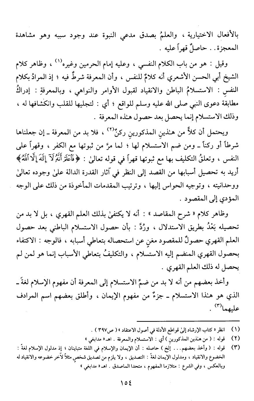 وقيل: هو من باب الكلام النفسي، وعليه إمام الحرمين وغيره (¬1)، وظاهر كلام الشيخ أبي الحسن الأشعري أنه كلامٌ للنفس، وأن المعرفة شرطٌ فيه؛ إذ المرادُ بكلام النفسِ: الاستسلامُ الباطن والانقياد لقبول الأوامر والنواهي، وبالمعرفةِ: إدراكُ مطابقة دعوى النبي صلى اللَّه عليه وسلم للواقع؛ أي: لتجليها للقلب وانكشافها له، وذلك الاستسلام إنما يحصل بعد حصول هذه المعرفة.