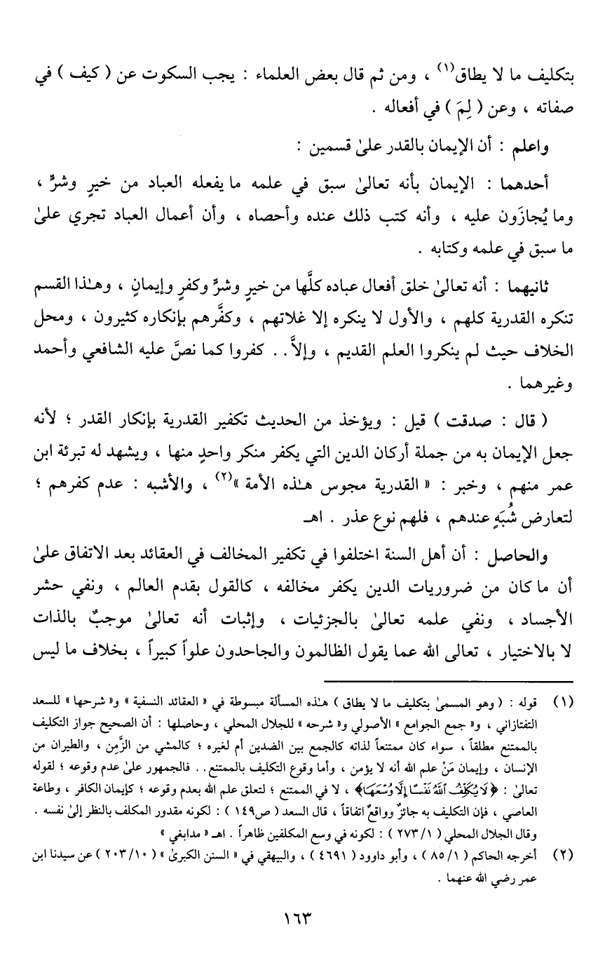 ثانيهما: أنه تعالى خلق أفعال عباده كلَّها من خيرٍ وشرٍّ وكفرٍّ وإيمانٍ، وهذا القسم تنكره القدرية كلهم، والأول لا ينكره إلا غلاتهم، وكفَّرهم بإنكاره كثيرون، ومحل الخلاف حيث لم ينكروا العلم القديم، وإلَّا. . كفروا كما نصَّ عليه الشافعي وأحمد وغيرهما.