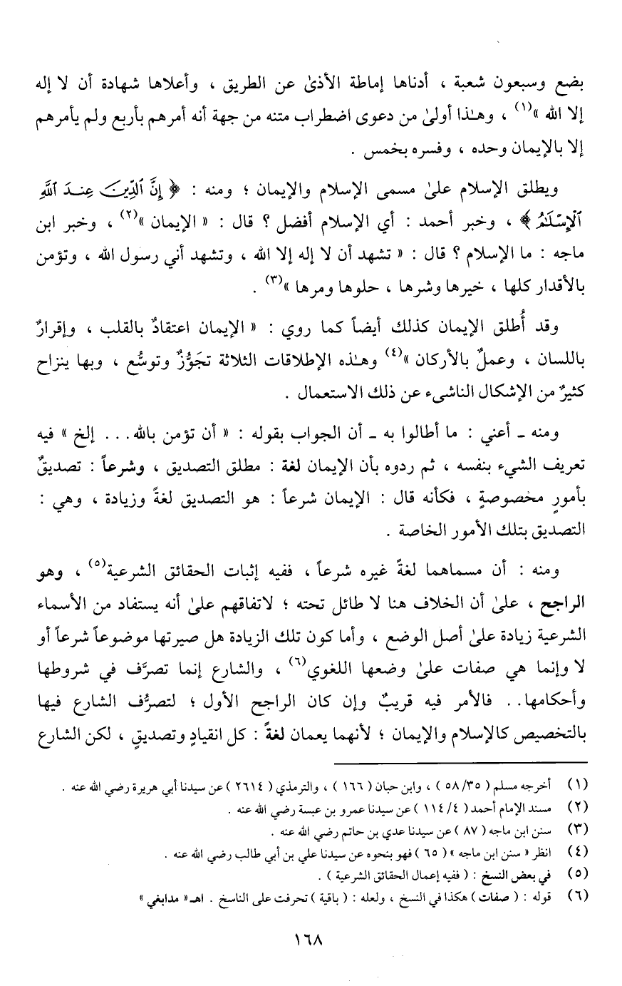 وقد أُطلق الإيمان كذلك أيضًا كما روي: "الإيمان اعتقاد بالقلب، وإقرارٌ باللسان، وعملٌ بالأركان" (¬4) وهذه الإطلاقات الثلاثة تجَوُّزٌ وتوسُّع، وبها ينزاح كثيرٌ من الإشكال الناشئ عن ذلك الاستعمال.