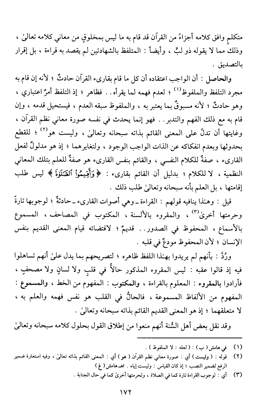 والحاصل: أن الواجب اعتقاده أن كل ما قام بقارئ القرآن حادثٌ؛ لأنه إن قام به مجرد التلفظ والملفوظ (¬1)؛ لعدم فهمه لما يقرأه. . فظاهر؛ إذ التلفظ أمرٌ اعتباري، وهو حادثٌ؛ لأنه مسبوق بما يعتبر به، والملفوظ سبقه العدم، فيستحيل قدمه، وإن قام به مع ذلك الفهم والتدبر. . فهو إنما يحدث في نفسه صورة معاني نظم القرآن، وغايتها أن تدلَّ على المعنى القائم بذاته سبحانه وتعالى، وليست هو (¬2)؛ للقطع بحدوثها وبعدم انفكاكه عن الذات الواجب الوجود، ولتغايرهما؛ إذ هو مدلولٌ لفعل القارئ، صفةٌ للكلام النفسي، والقائم بنفس القارئ هو صفةٌ للعلم بتلك المعاني النظمية، لا للكلام؛ بدليل أن القائم بقارئ: {وَأَقِيمُوا الصَّلَاةَ} ليس طلب إقامتها، بل العلم بأنه سبحانه وتعالى طلب ذلك.