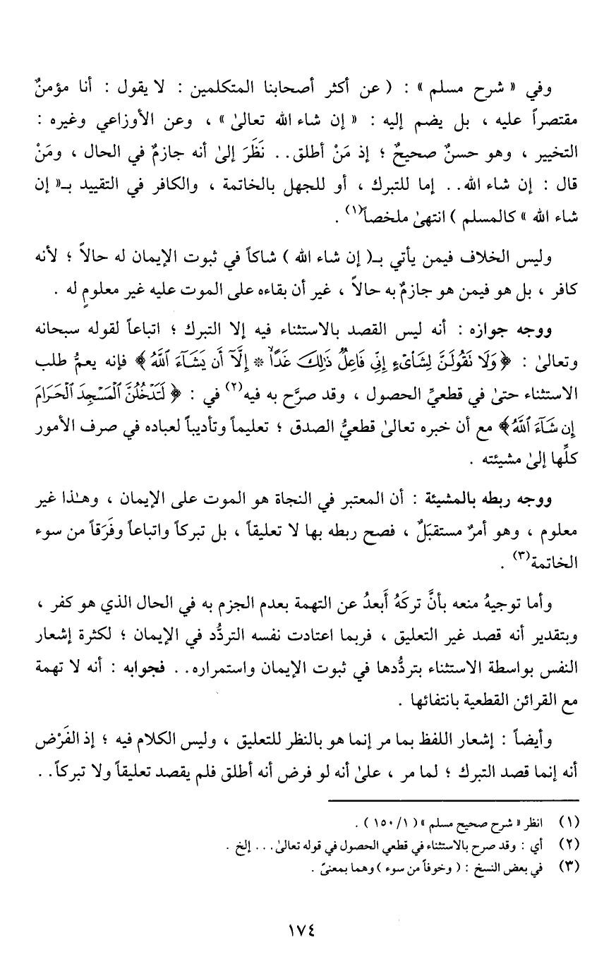 وفي "شرح مسلم": (عن أكثر أصحابنا المتكلمين: لا يقول: أنا مؤمنٌ مقتصرًا عليه، بل يضم إليه: "إن شاء اللَّه تعالى"، وعن الأوزاعي وغيره: التخيير، وهو حسنٌ صحيحٌ؛ إذ مَنْ أطلق. . نَظَرَ إلى أنه جازمٌ في الحال، ومَنْ قال: إن شاء اللَّه. . إما للتبرك، أو للجهل بالخاتمة، والكافر في التقييد بـ "إن شاء اللَّه" كالمسلم) انتهى ملخصا" (¬1).