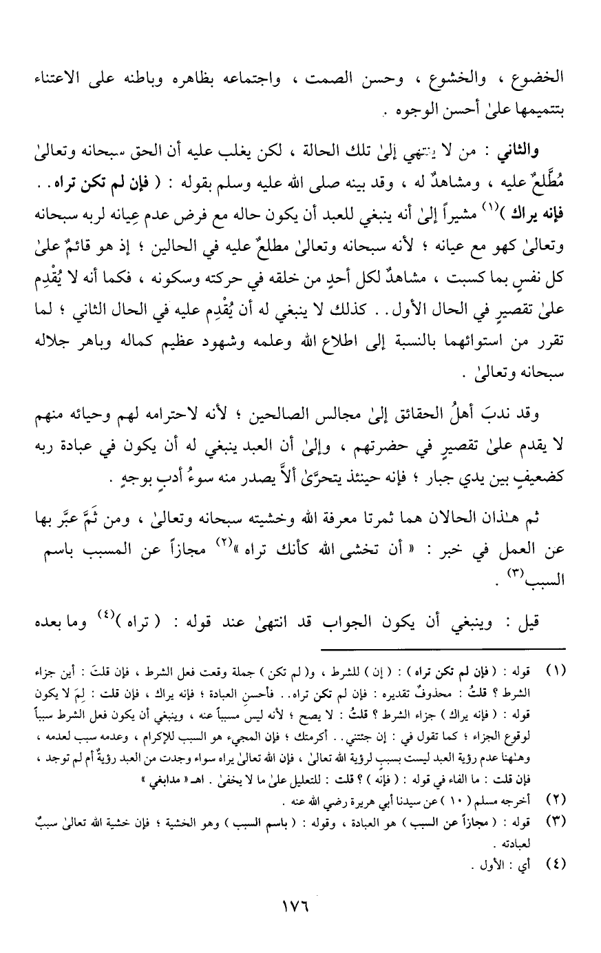 والثاني: من لا ينتهي إلى تلك الحالة، لكن يغلب عليه أن الحق له سبحانه وتعالى مُطَّلعٌ عليه، ومشاهدٌ له، وقد بينه صلى اللَّه عليه وسلم بقوله: (فإن لم تكن تراه. . فإنه يراك) (¬1) مشيرًا إلى أنه ينبغي للعبد أن يكون حاله مع فرض عدم عِيانه لربه سبحانه وتعالى كهو مع عيانه؛ لأنه سبحانه وتعالى مطلع عليه في الحالين؛ إذ هو قائم على كل نفسٍ بما كسبت، مشاهدٌ لكل أحدٍ من خلقه في حركته وسكونه، فكما أنه لا يُقْدِم على تقصيرٍ في الحال الأول. . كذلك لا ينبغي له أن يُقْدِم عليه في الحال الثاني؛ لما تقرر من استوائهما بالنسبة إلى اطلاع اللَّه وعلمه وشهود عظيم كماله وباهر جلاله سبحانه وتعالى.