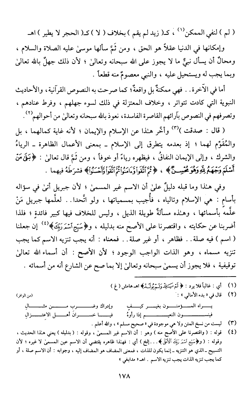 وفي هذا وما قبله دليلٌ على أن الاسم غير المسمى؛ لأن جبريل أتى في سؤاله بأسامٍ: هي الإسلام وتالياه، فأُجيب بمسمياتها، ولو اتَّحدا. . لعلَّمها جبريل مَنْ علَّمه بأسمائها، وهذه مسألةٌ طويلة الذيل، وليس للخلاف فيها كبير فائدة؛ فلذا أضربنا عن حكايته، واقتصرنا على الأصح منه بدليله، و {سَبِّحِ اسْمَ رَبِّكَ} (¬4) إن جعلنا (اسم) فيه صلة. . فظاهر، أو غير صلة. . فمعناه: أنه يجب تنزيه الاسم كما يجب تنزيه مسماه، وهو الذات الواجب الوجود؛ لأن الأصح: أن أسماء اللَّه تعالى توقيفية، فلا يجوز أن يسمى سبحانه وتعالى إلا بما صح عن الشارع أنه من أسمائه.