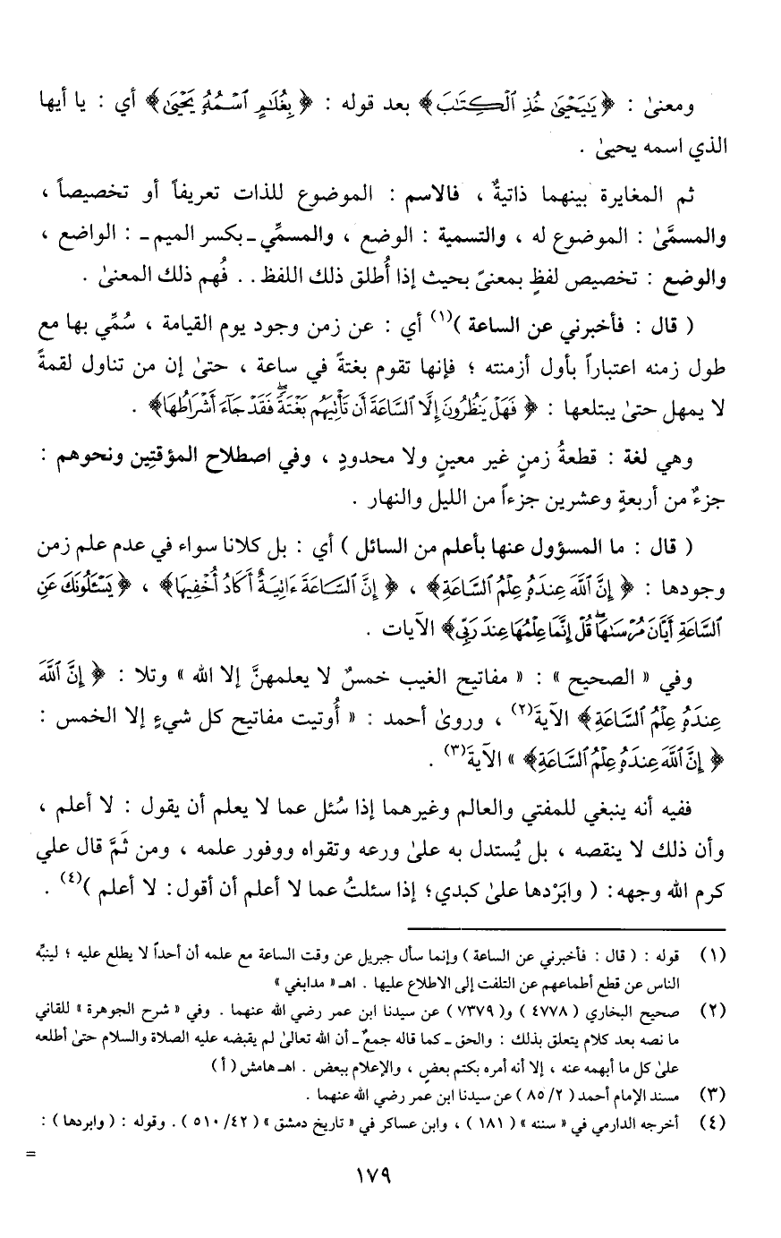 (¬2) صحيح البخاري (4778) و (1/ 379) عن سيدنا ابن عمر رضي اللَّه عنهما. وفي "شرح الجوهرة" للقاني ما نصه بعد كلام يتعلق بذلك: والحق -كما قاله جمعٌ- أن اللَّه تعالى لم يقبضه عليه الصلاة والسلام حتى أطلعه على كل ما أبهمه عنه، إلا أنه أمره بكتم بعضٍ، والإعلام ببعض. اهـ هامش (أ).
