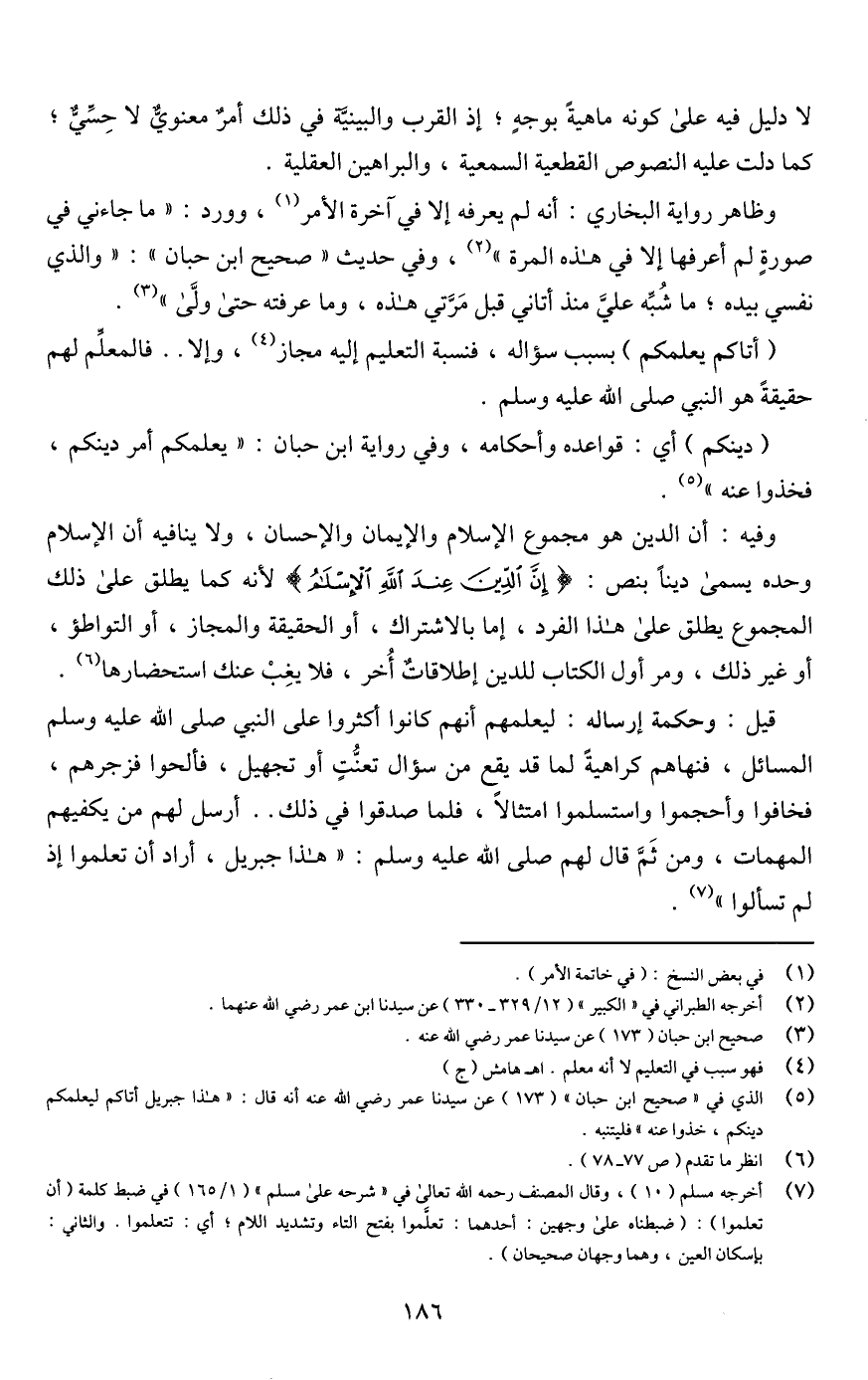 (¬5) الذي في "صحيح ابن حبان" (173) عن سيدنا عمر رضي اللَّه عنه أنه قال: "هذا جبريل أتاكم ليعلمكم دينكم، خذوا عنه" فليتنبه.