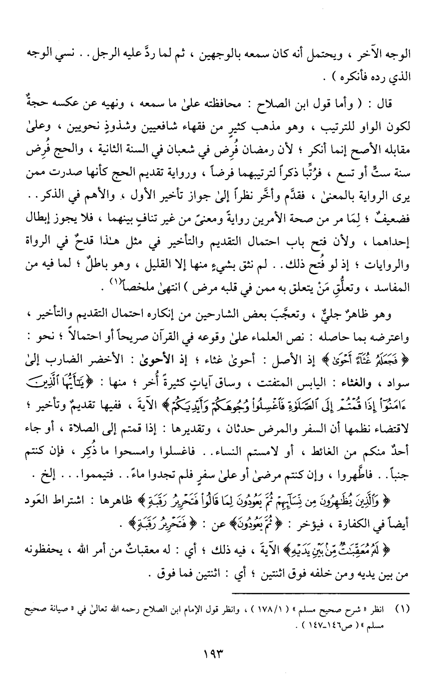 وهو ظاهرٌ جليٌّ، وتعجَّبَ بعض الشارحين من إنكاره احتمال التقديم والتأخير، واعترضه بما حاصله: نص العلماء على وقوعه في القرآن صريحًا أو احتمالًا؛ نحو: {فَجَعَلَهُ غُثَاءً أَحْوَى} إذ الأصل: أحوى غثاء؛ إذ الأحوى: الأخضر الضارب إلى سواد، والغثاء: اليابس المتفتت، وساق آياتٍ كثيرةً أُخر؛ منها: {الَّذِينَ آمَنُوا إِذَا قُمْتُمْ إِلَى الصَّلَاةِ فَاغْسِلُوا وُجُوهَكُمْ وَأَيْدِيَكُمْ} الآيةَ، ففيها تقديمٌ وتأخير؛ لاقتضاء نظمها أن السفر والمرض حدثان، وتقديرها: إذا قمتم إلى الصلاة، أو جاء أحدٌ منكم من الغائط، أو لامستم النساء. . فاغسلوا وامسحوا ما ذُكِر، فإن كنتم جنبًا. . فاطَّهروا، وإن كنتم مرضى أو على سفرٍ فلم تجدوا ماءً. . فتيمموا. . . إلخ.